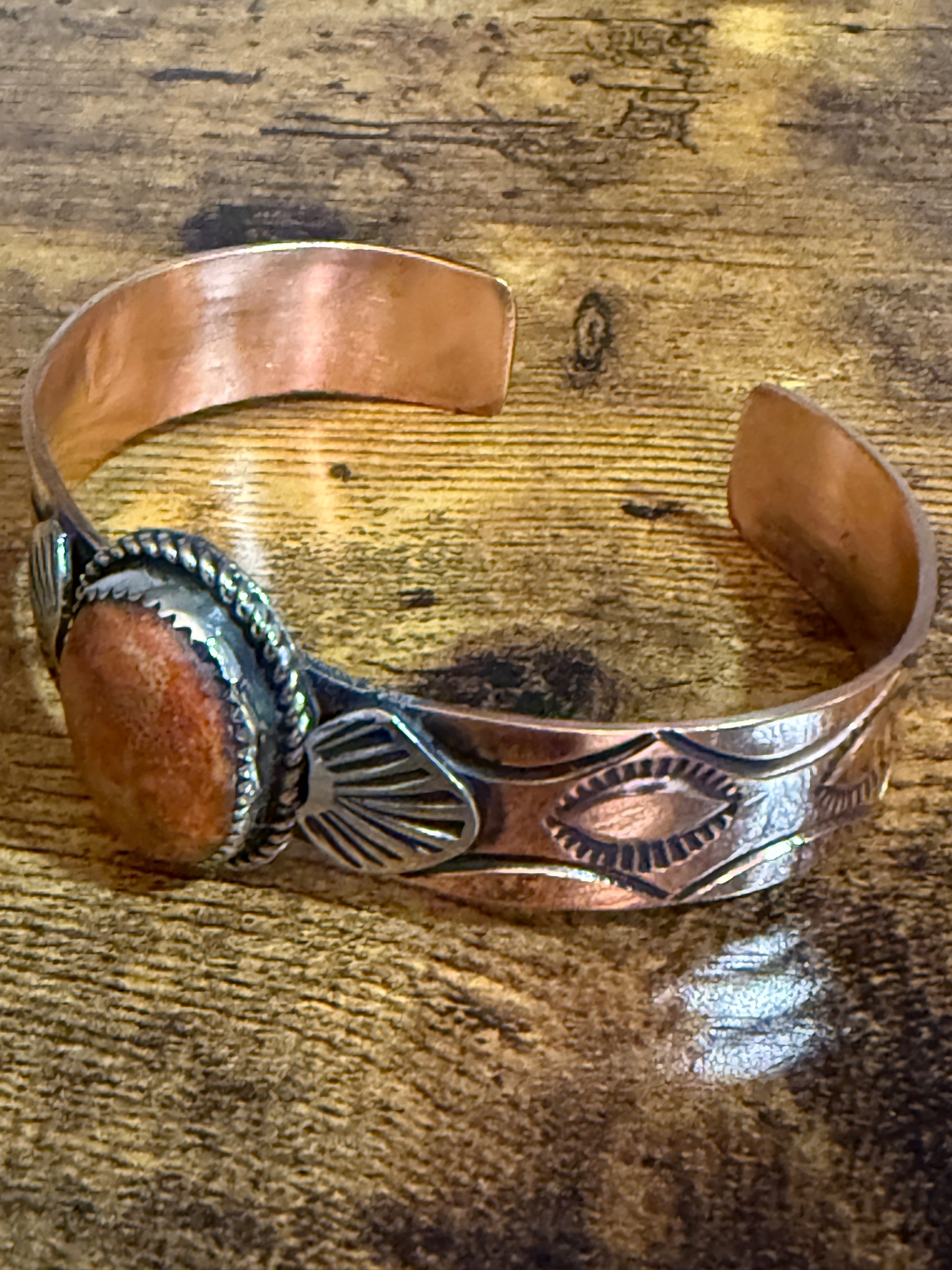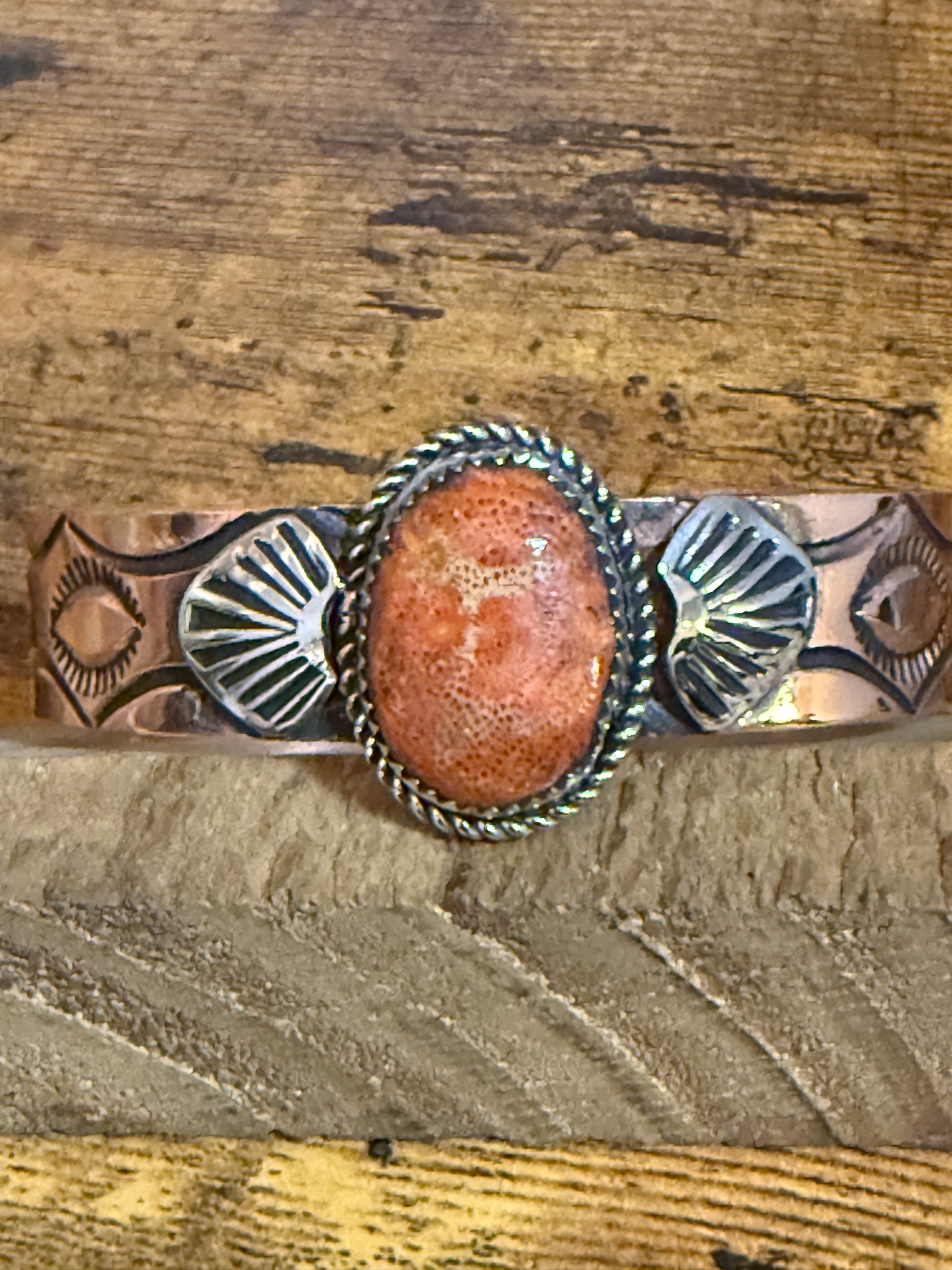 Navajo Copper And Apple Coral Cuff Bracelet Signed By Jackie Cleveland