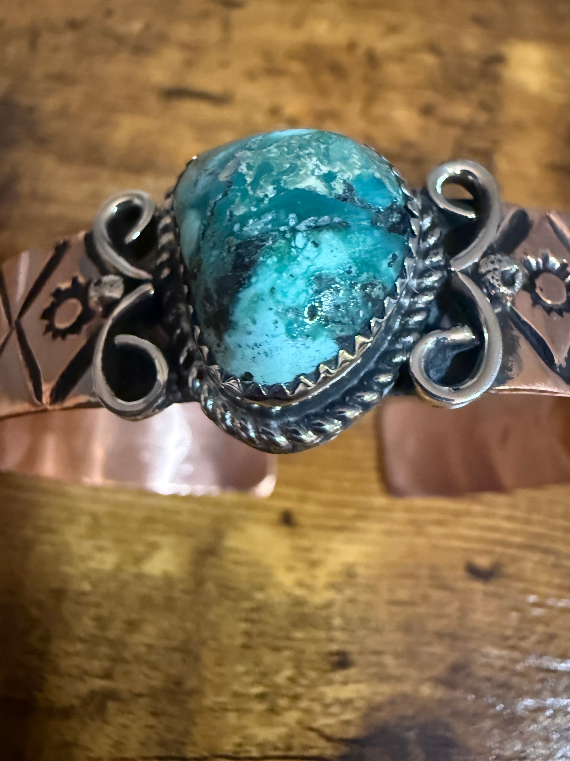 - Handcrafted Navajo copper cuff featuring vivid turquoise stones set in a warm copper tone for a striking, enduring centerpiece.