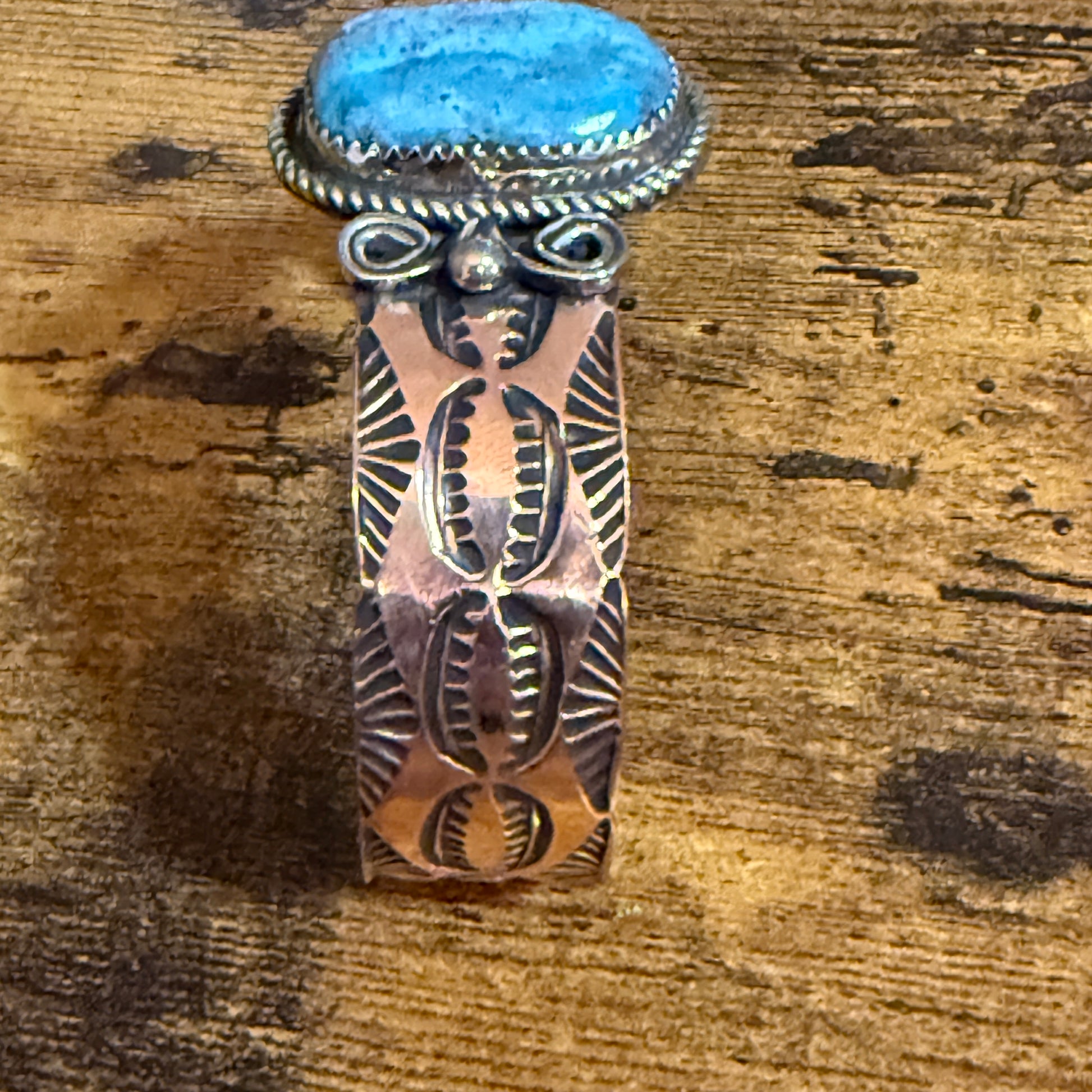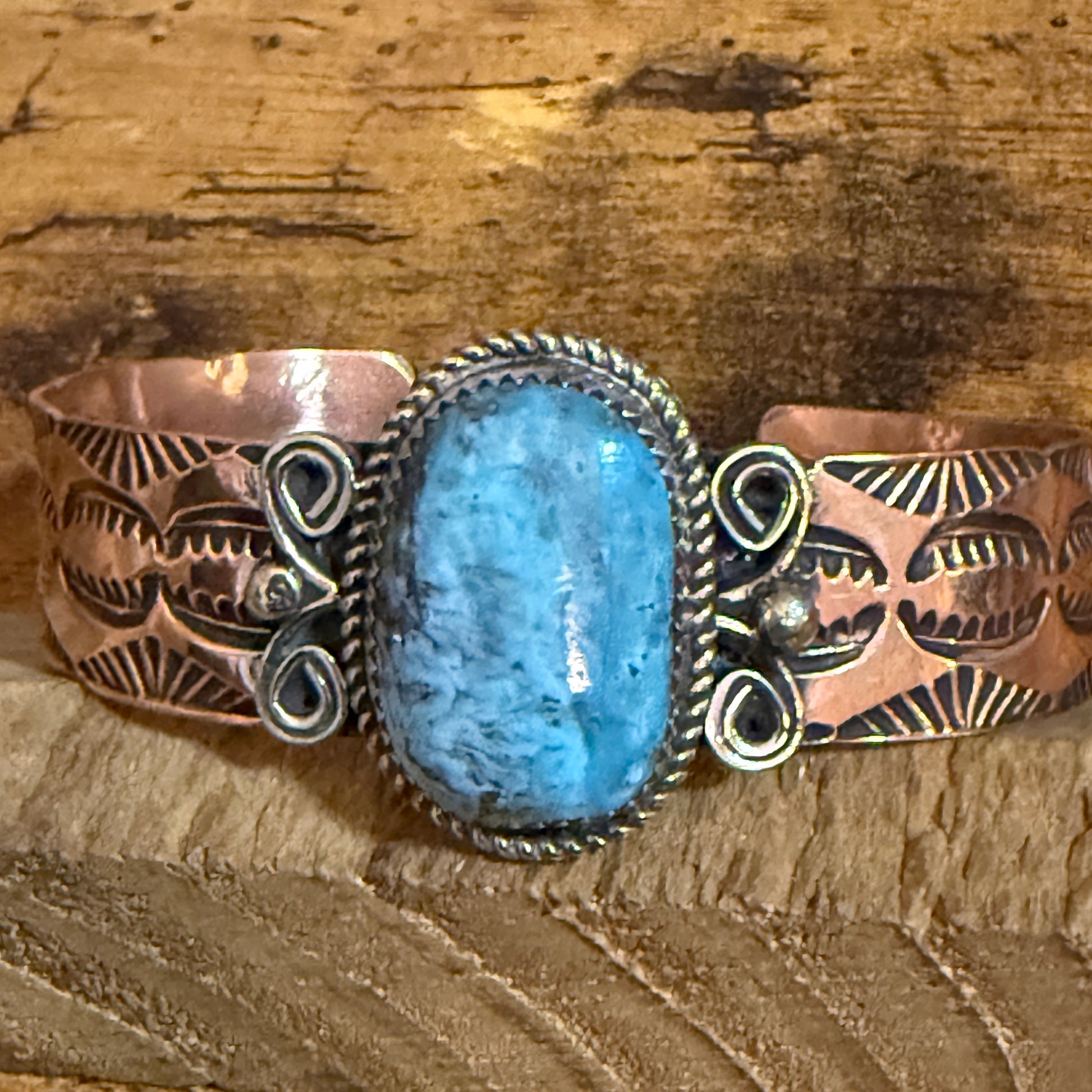 Enhance your collection with a unique, signed Navajo copper and turquoise cuff that merges heritage with contemporary elegance. Order today to own a piece of Native American art that tells a story with every wear.