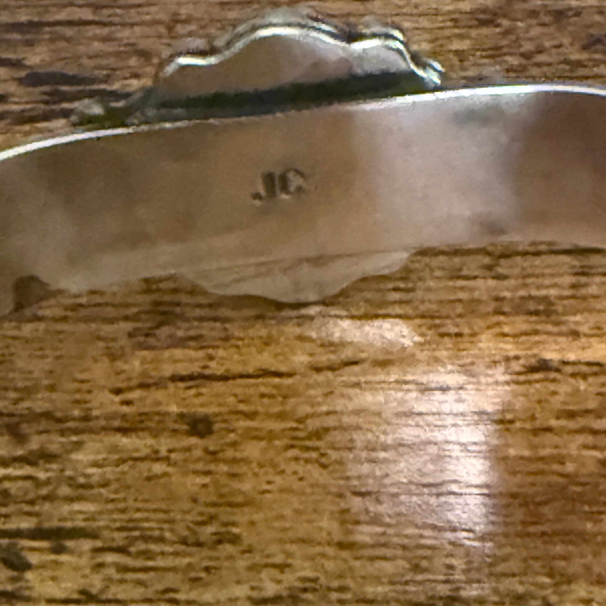 This authentic Navajo cuff bracelet showcases a striking green gaspéite stone set in nickel silver, bearing the signature of Cleveland—a respected artisan in Native American jewelry. Gaspéite, a rare phosphate mineral prized for its vibrant apple-green hue, pairs beautifully with the warm metallic tones of the nickel silver setting. The substantial cuff design offers both visual impact and comfortable wearability. Each piece reflects traditional Navajo craftsmanship and the artist's commitment to quality, making it a distinguished addition to any jewelry collection or a meaningful gift for those who appreciate indigenous artistry and natural gemstones.