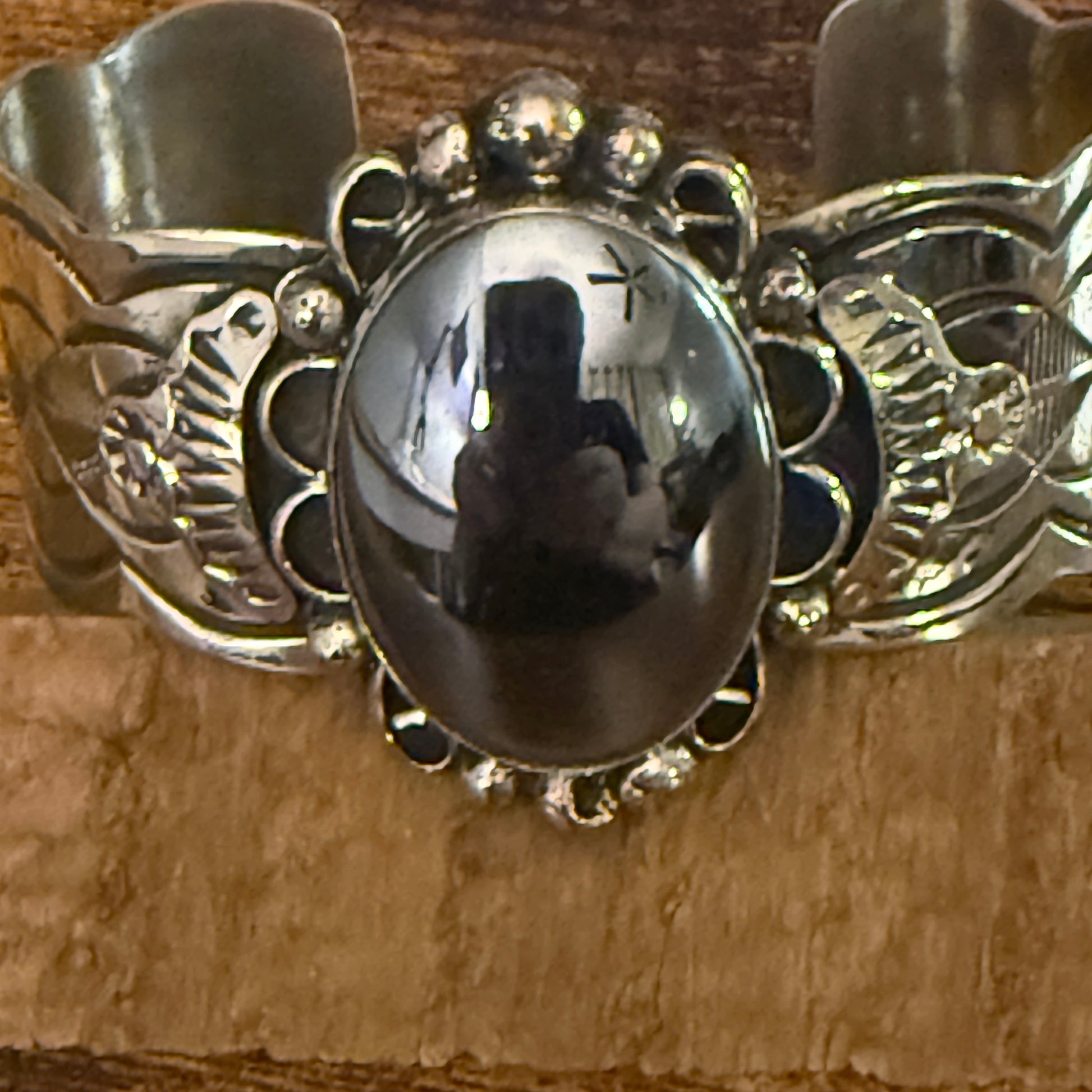 Navajo Hematite Wide Cuff Bracelet Signed Cleveland Nickel Silver