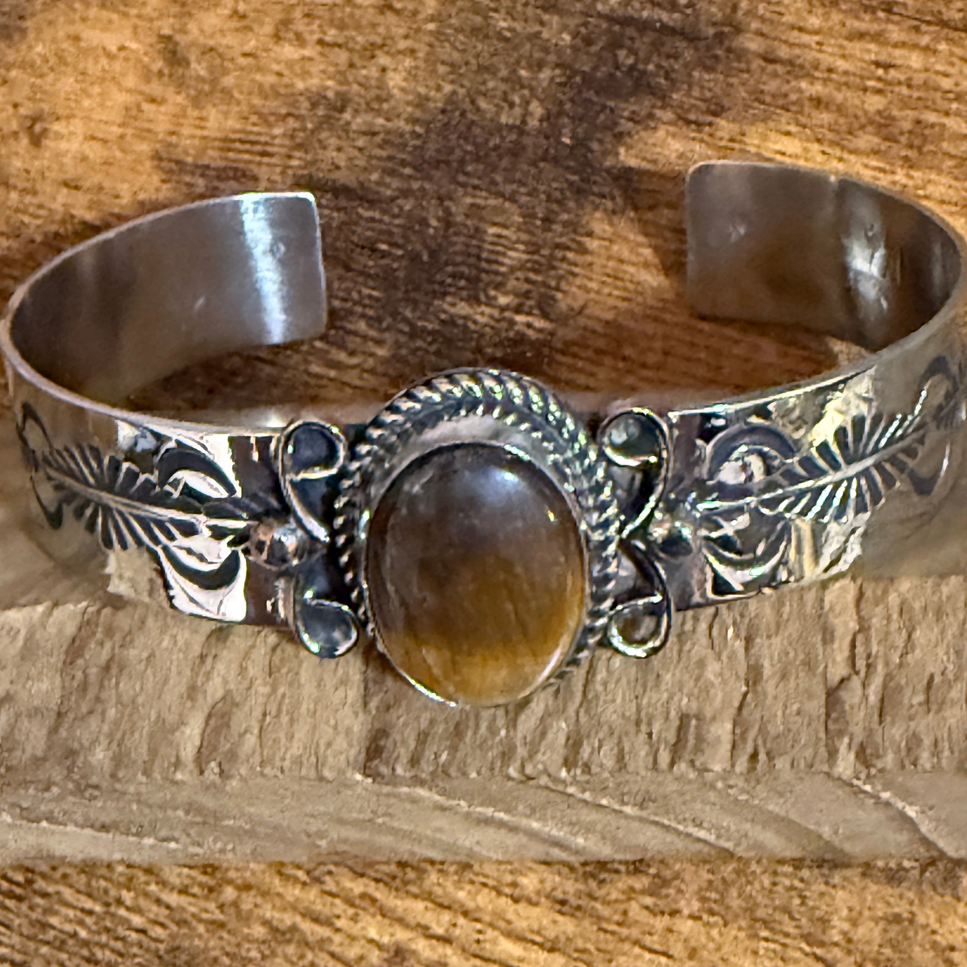 Designed for versatility, the open cuff slips on easily and pairs beautifully with casual outfits or more formal attire. Its classic silhouette complements other metals and stones, while the tiger eye centerpiece adds a touch of warmth and natural beauty to any ensemble.