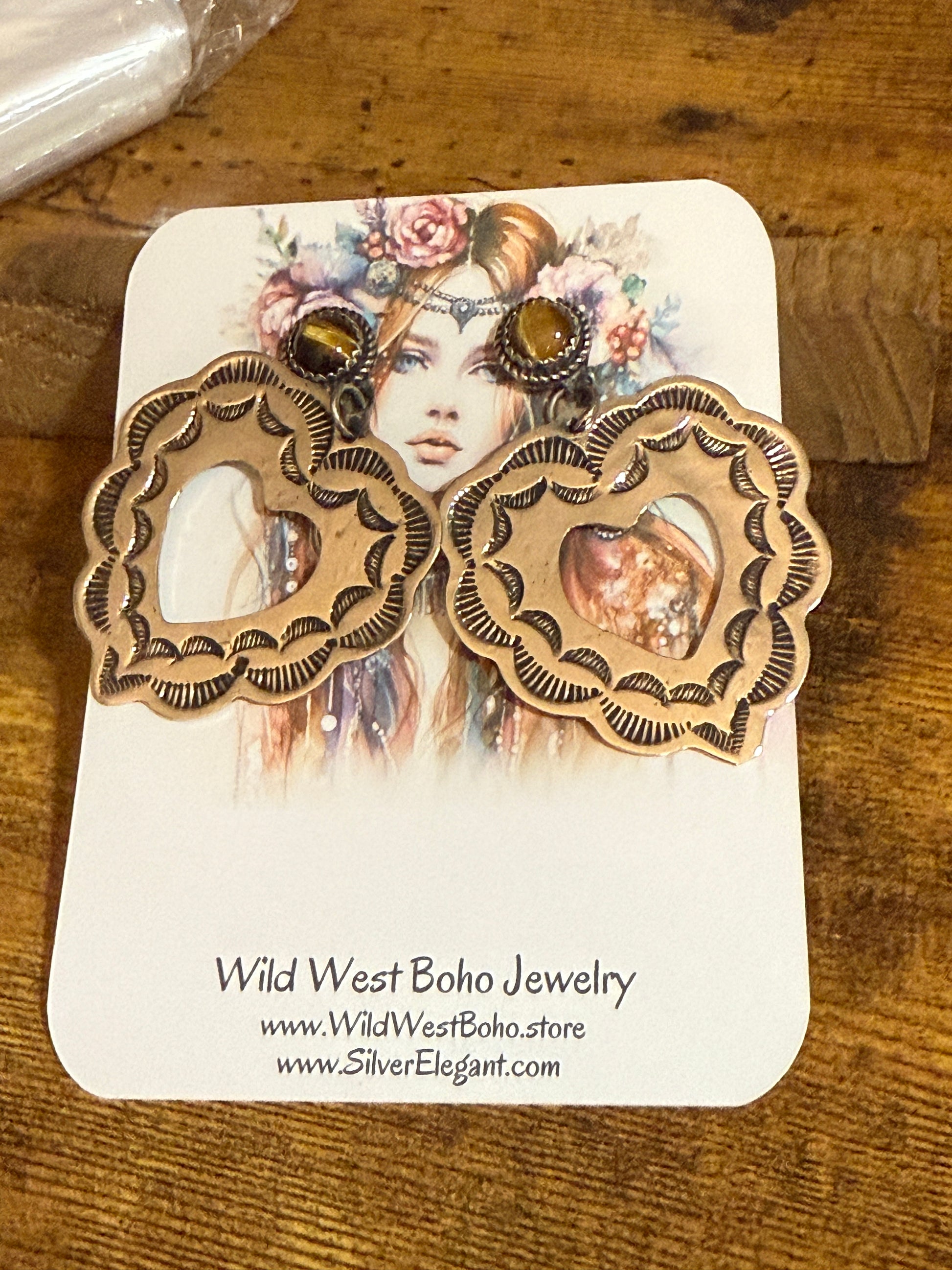 - Handcrafted Navajo nickel silver heart posts with decorative hand-stamped motifs and a radiant tiger eye centerpiece.