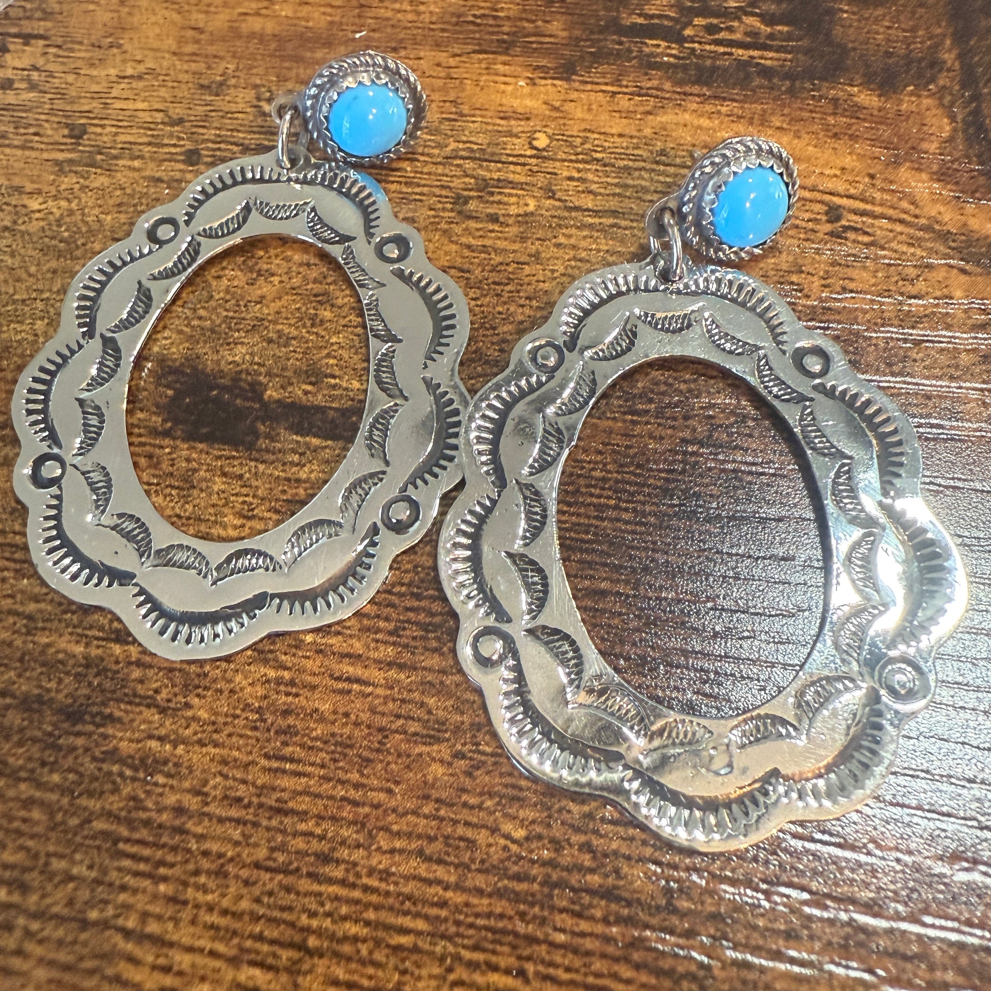 Elegant Navajo turquoise dangle earring, signed by Cleveland in a nickel silver setting — a bold Southwestern accent with authentic craftsmanship.