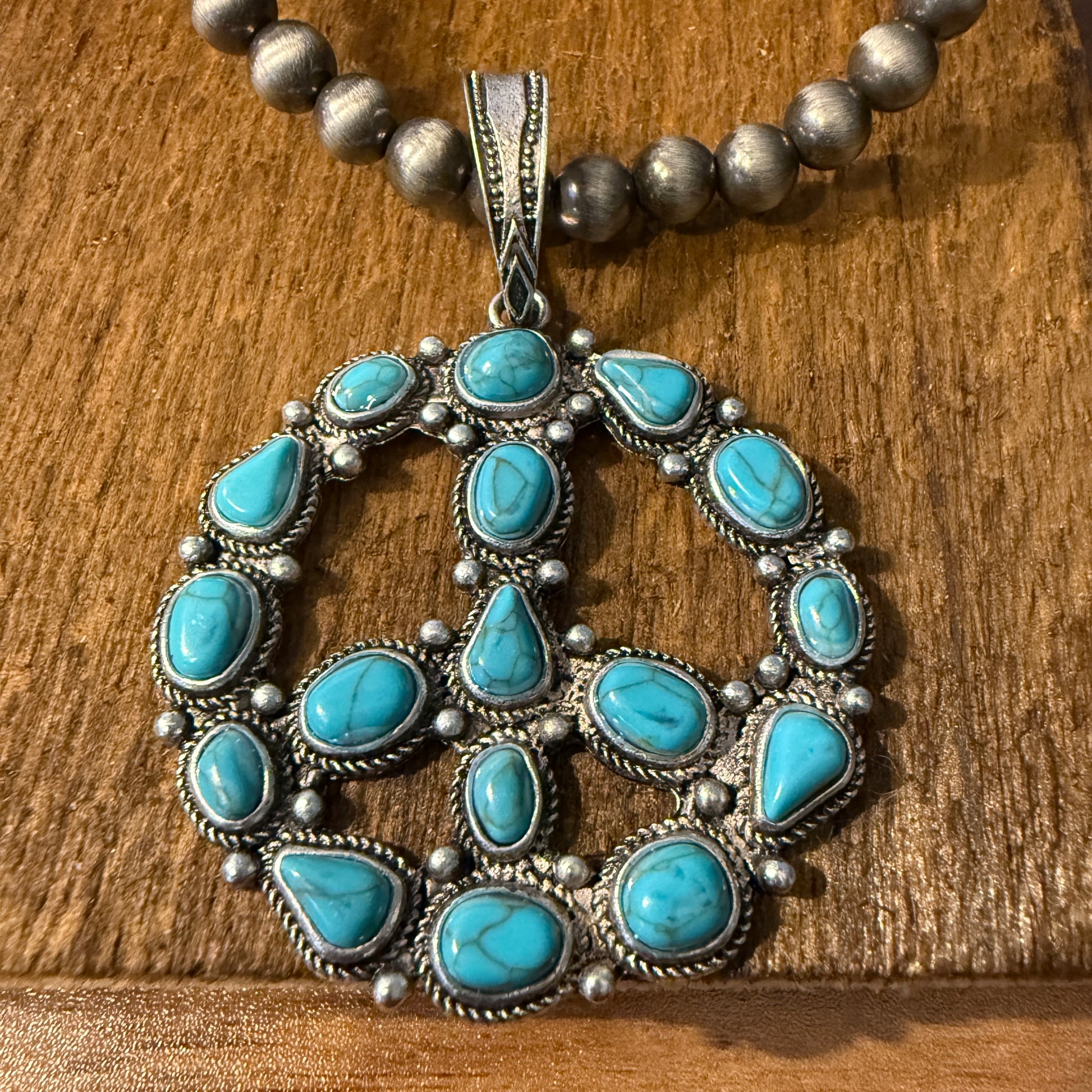 - Blue turquoise peace sign pendant creates a vibrant, symbolic focal point.