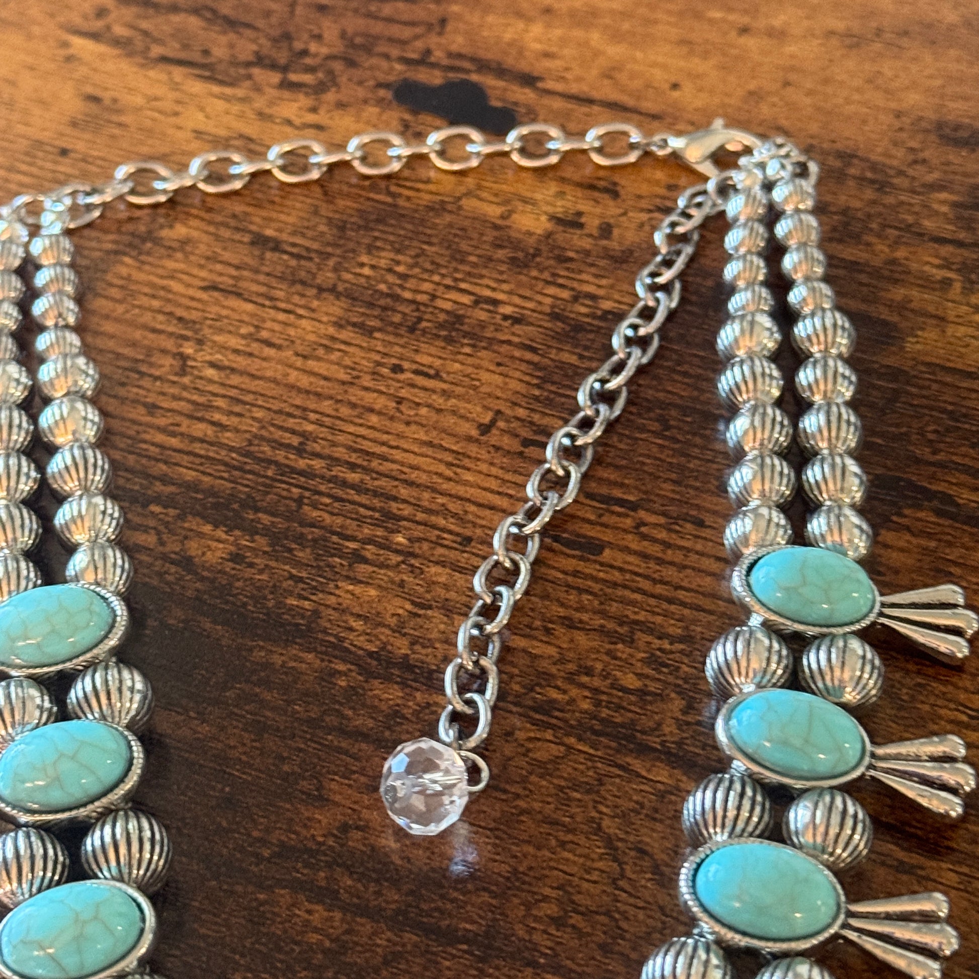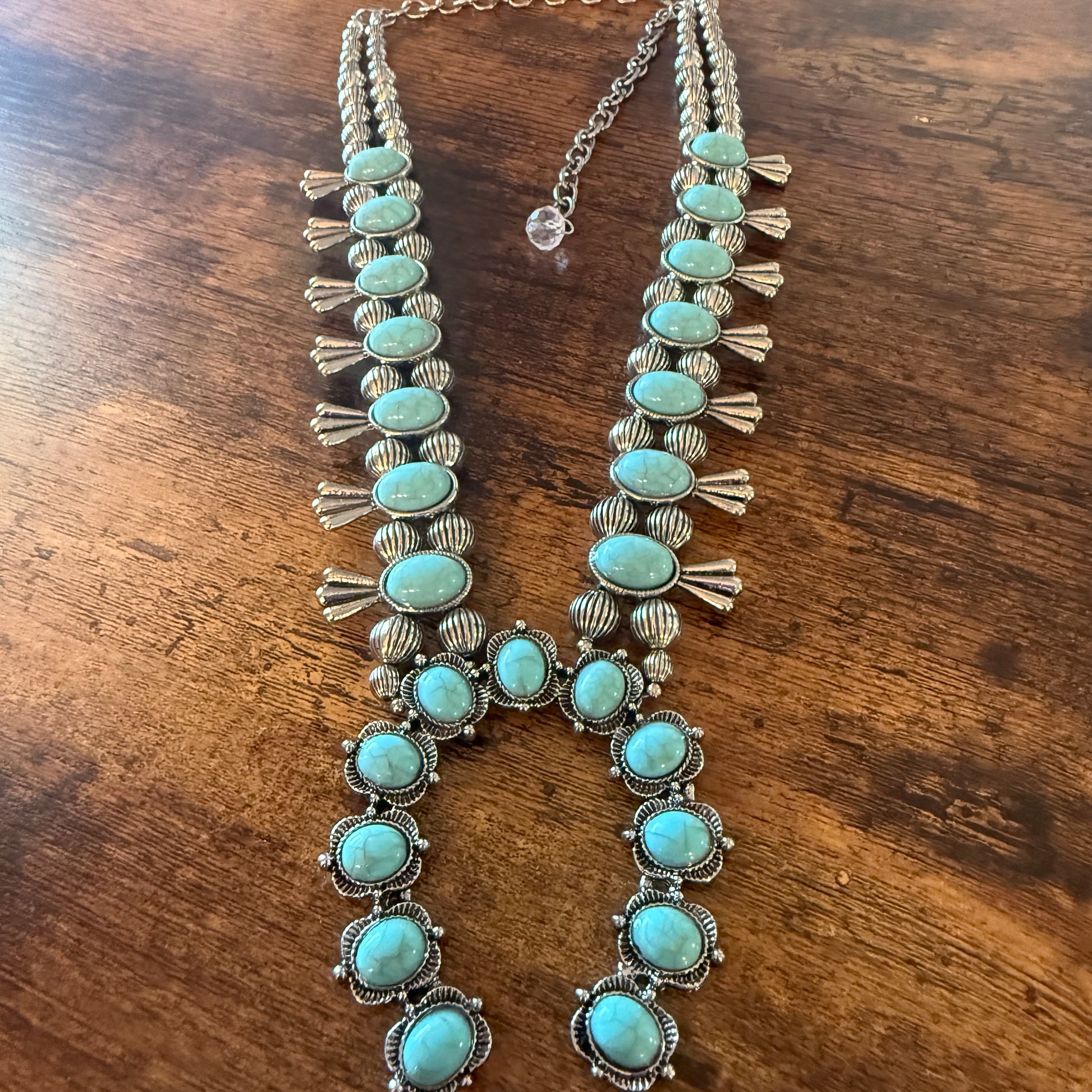 Why to buy this product? The Silver Blue Turquoise Stone Squash Blossom Necklace combines a timeless silver finish with vivid turquoise stones to deliver a standout accessory that complements a wide range of outfits and makes a thoughtful gift for turquoise lovers.