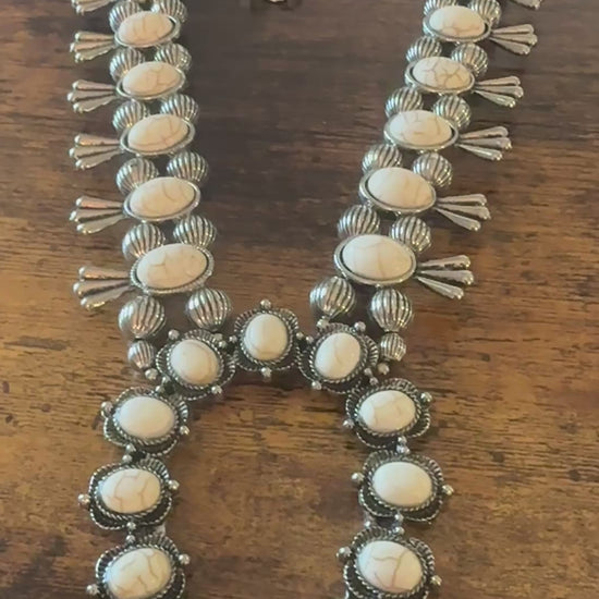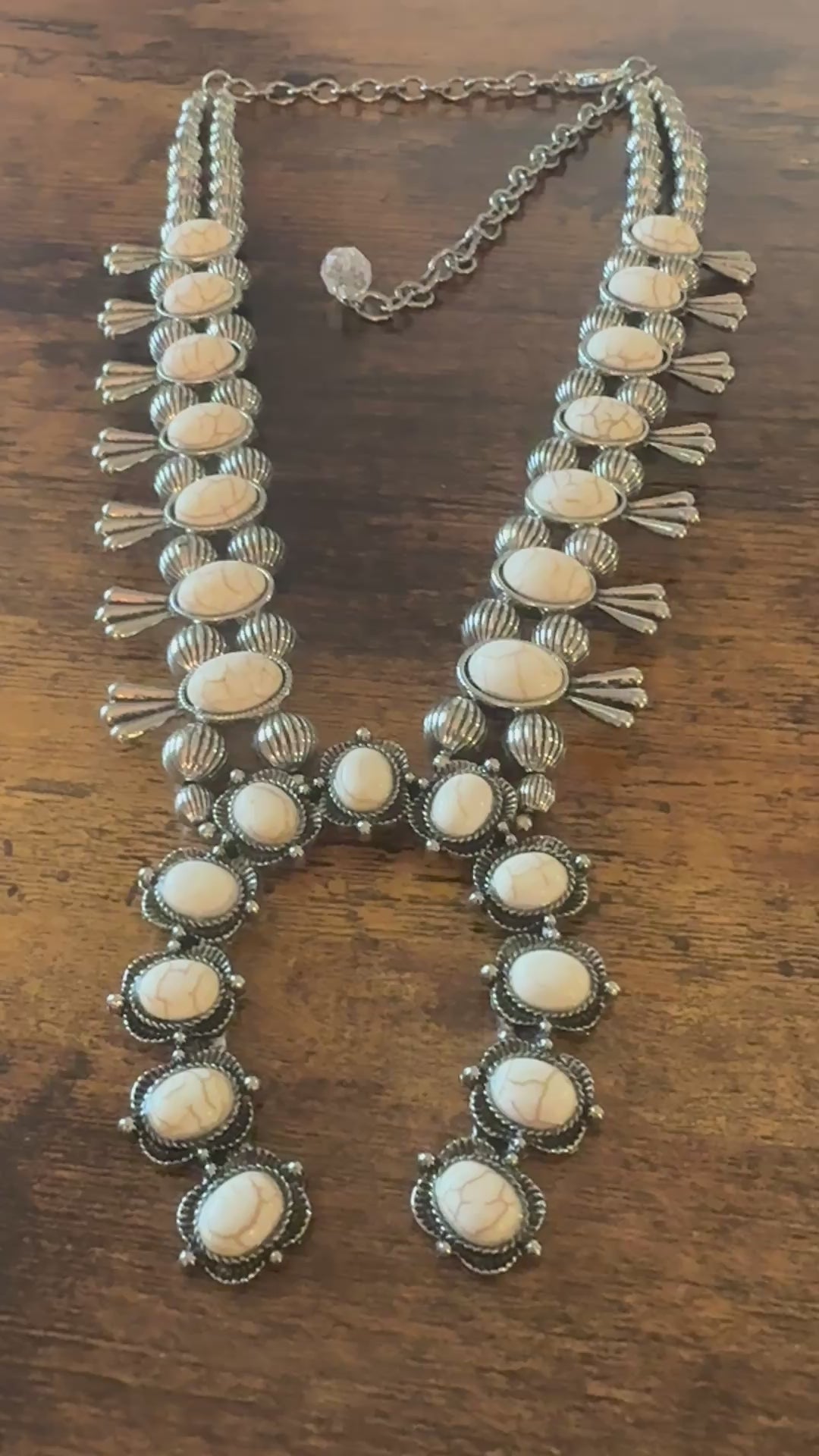 White Stone Squash Blossom Western Necklace, Faux Silver Pearl Beads