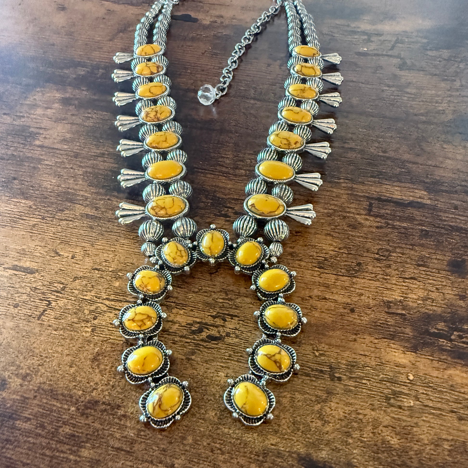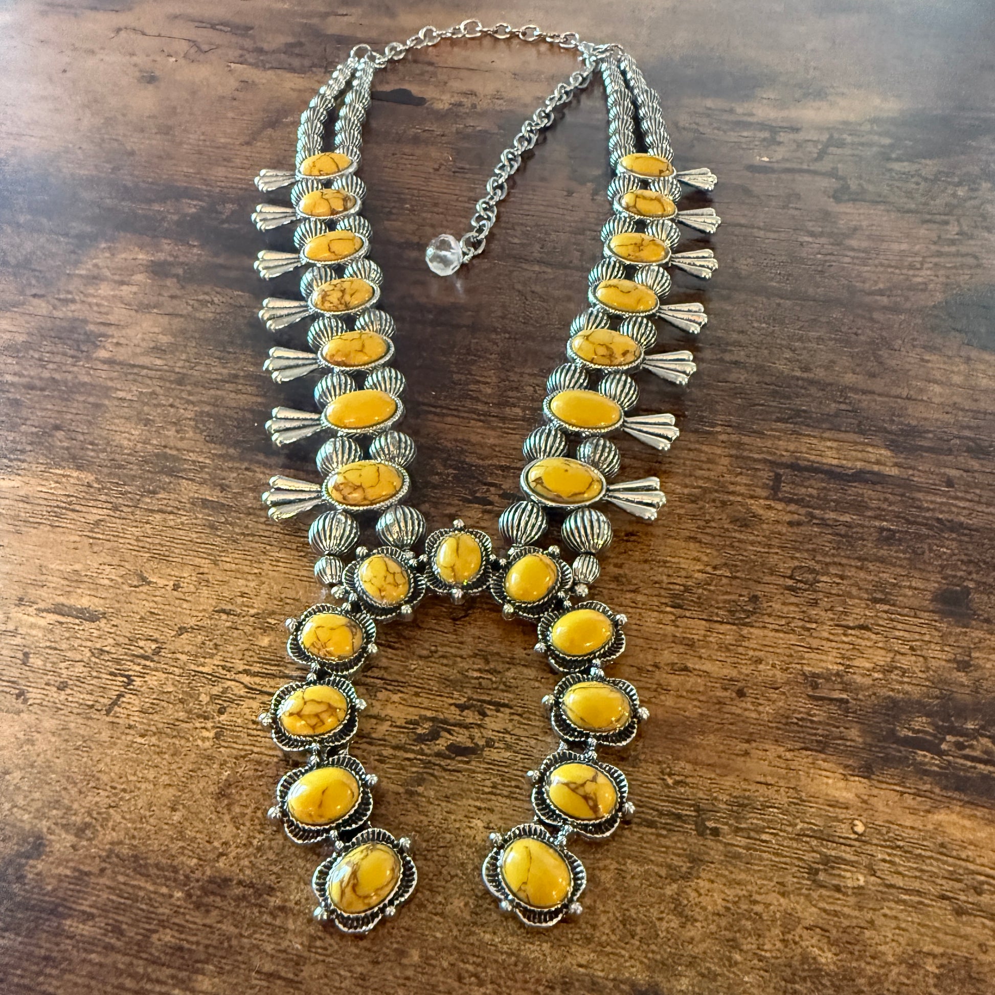 Indulge in a bold fusion of traditional western charm and contemporary style with the Yellow Stone Squash Blossom Necklace by Western Elite Jewelry. A vibrant yellow stone sits in a polished silver setting, creating a pendant that commands attention and compliments every outfit.
