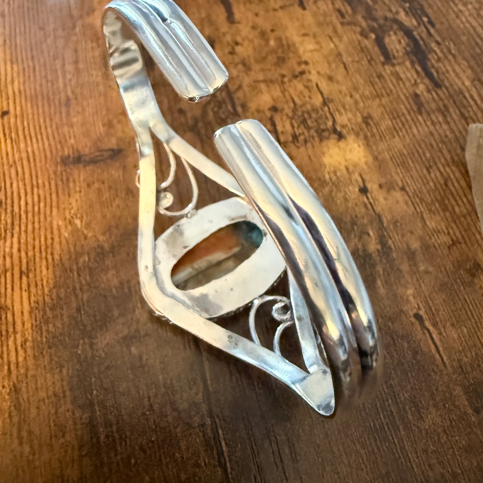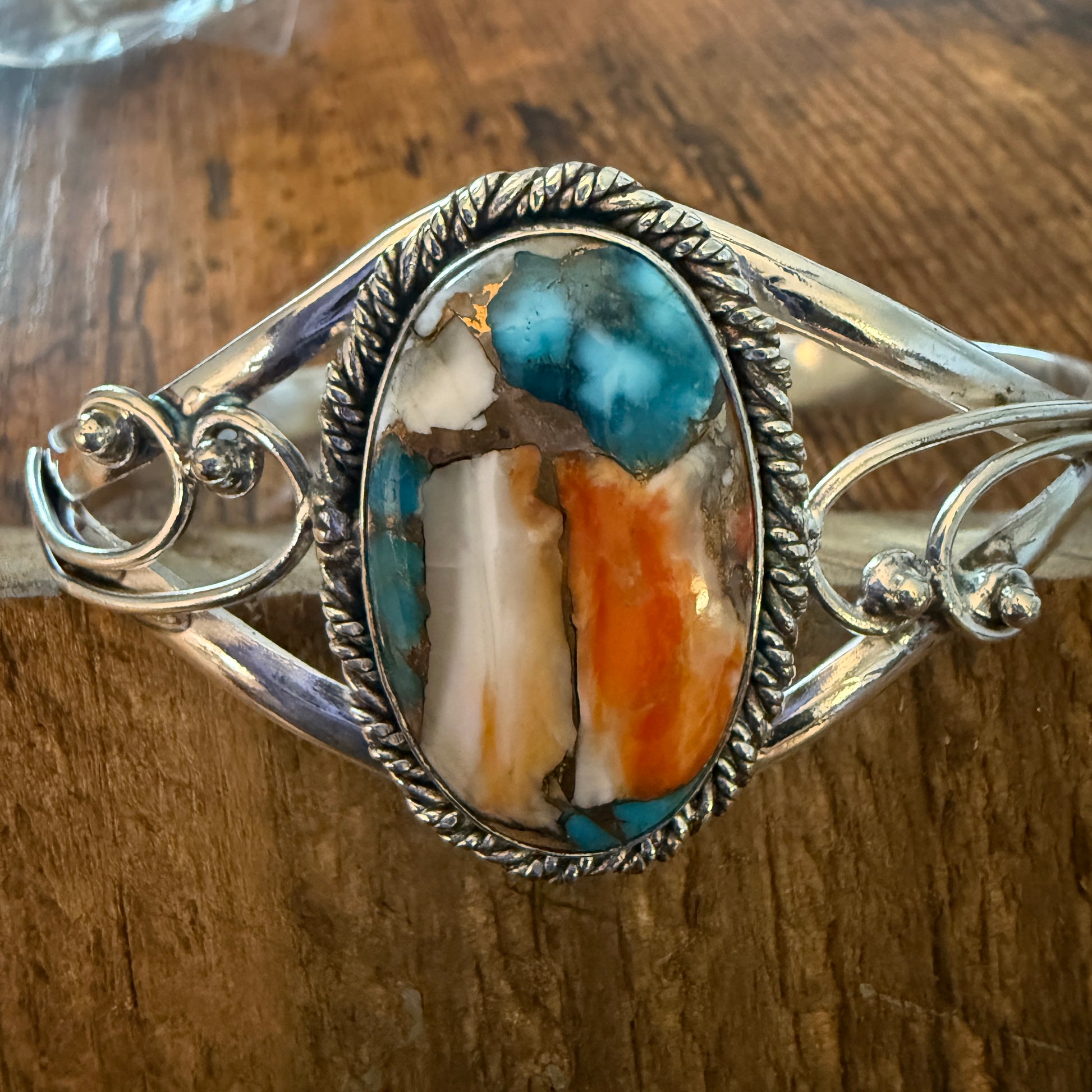 - Handmade 925 sterling silver bangle featuring a copper oyster motif and vibrant turquoise inlay for a unique, luxe look.