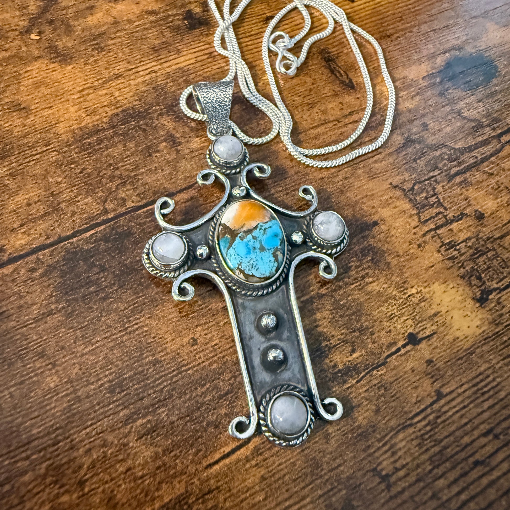 Religion Cross Blue Turquoise Copper Dalhia Oval Natural Stone Rainbow Moonstone Pendant Necklace