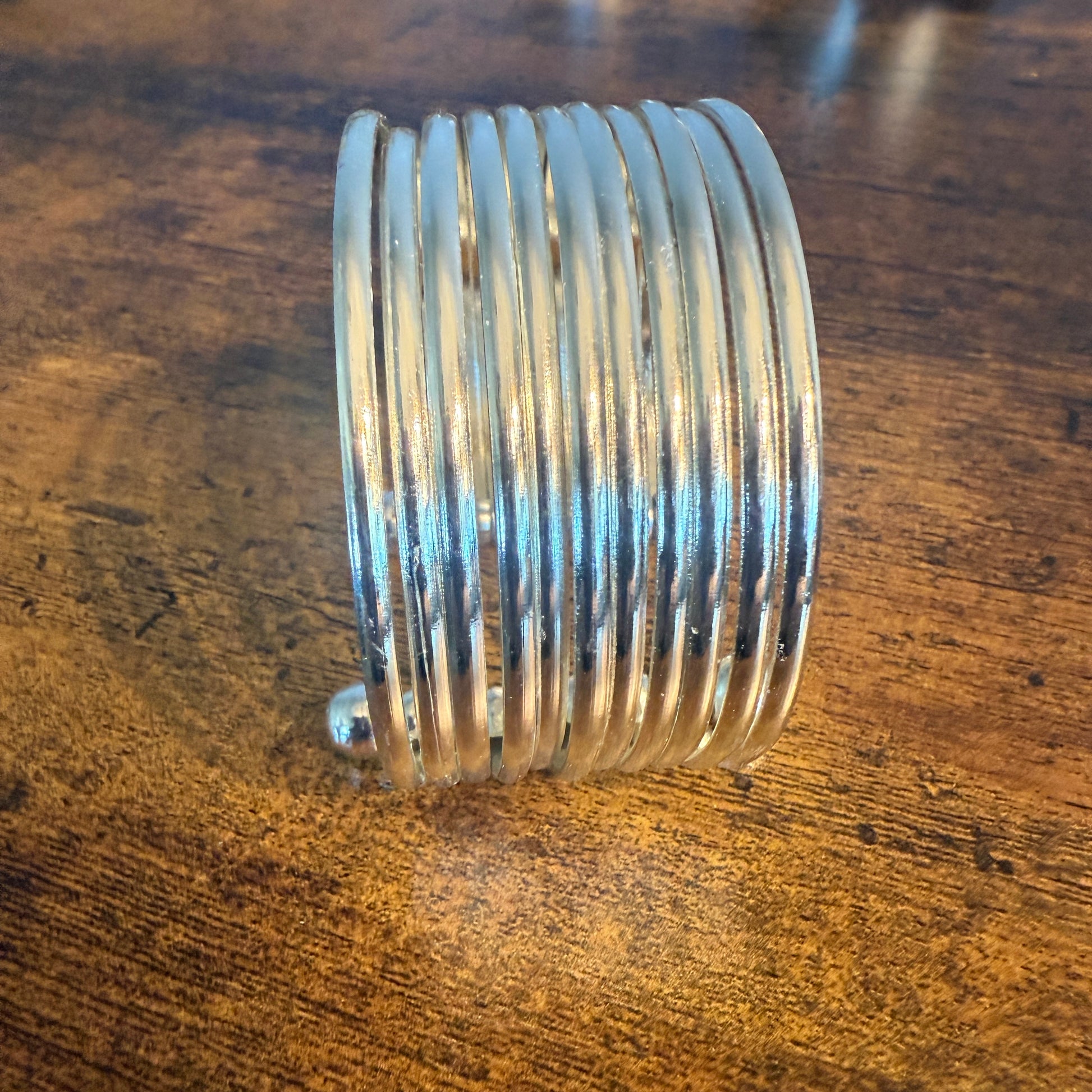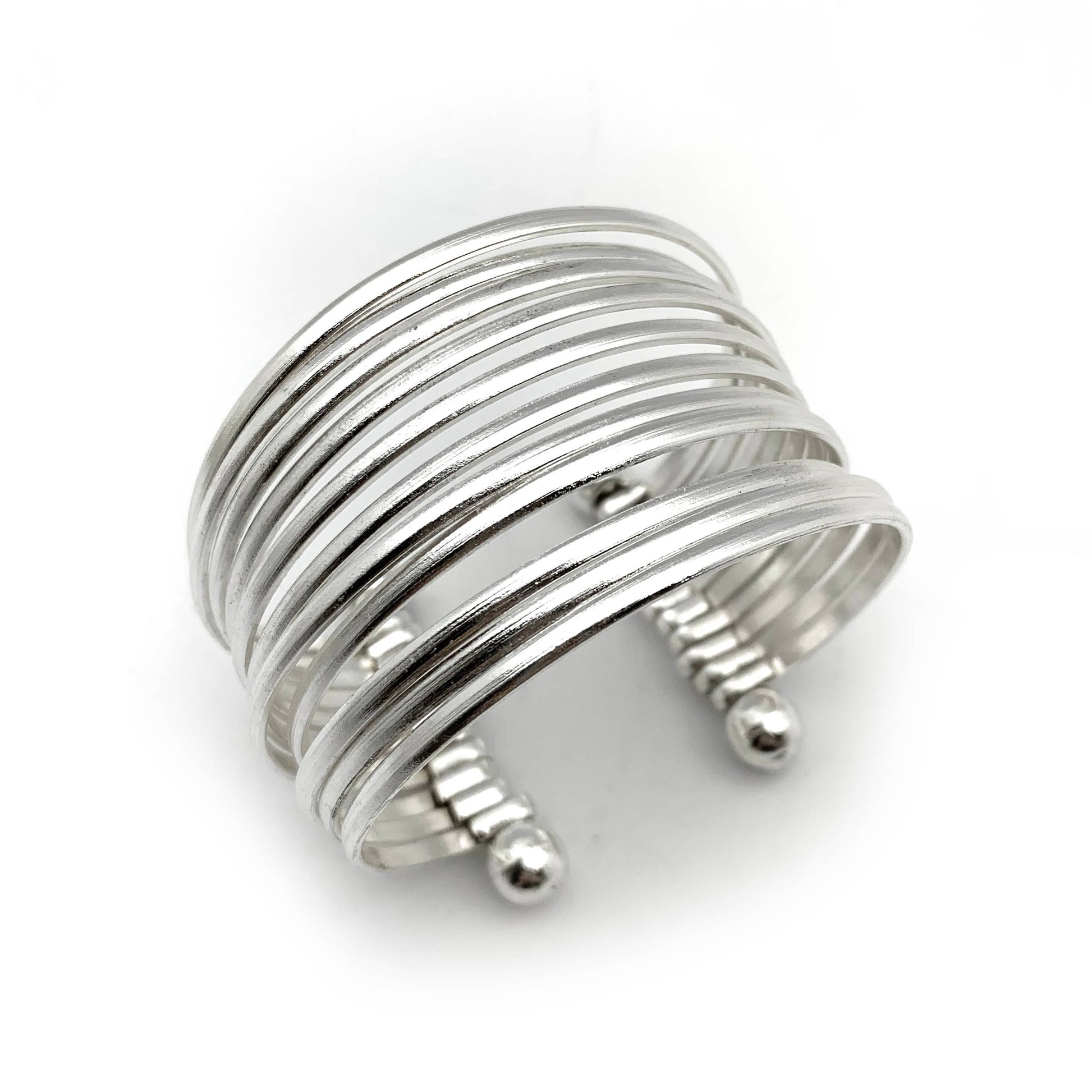 - Handcrafted silver-plated brass cuff featuring smooth, uninterrupted bands for a sleek, contemporary look.