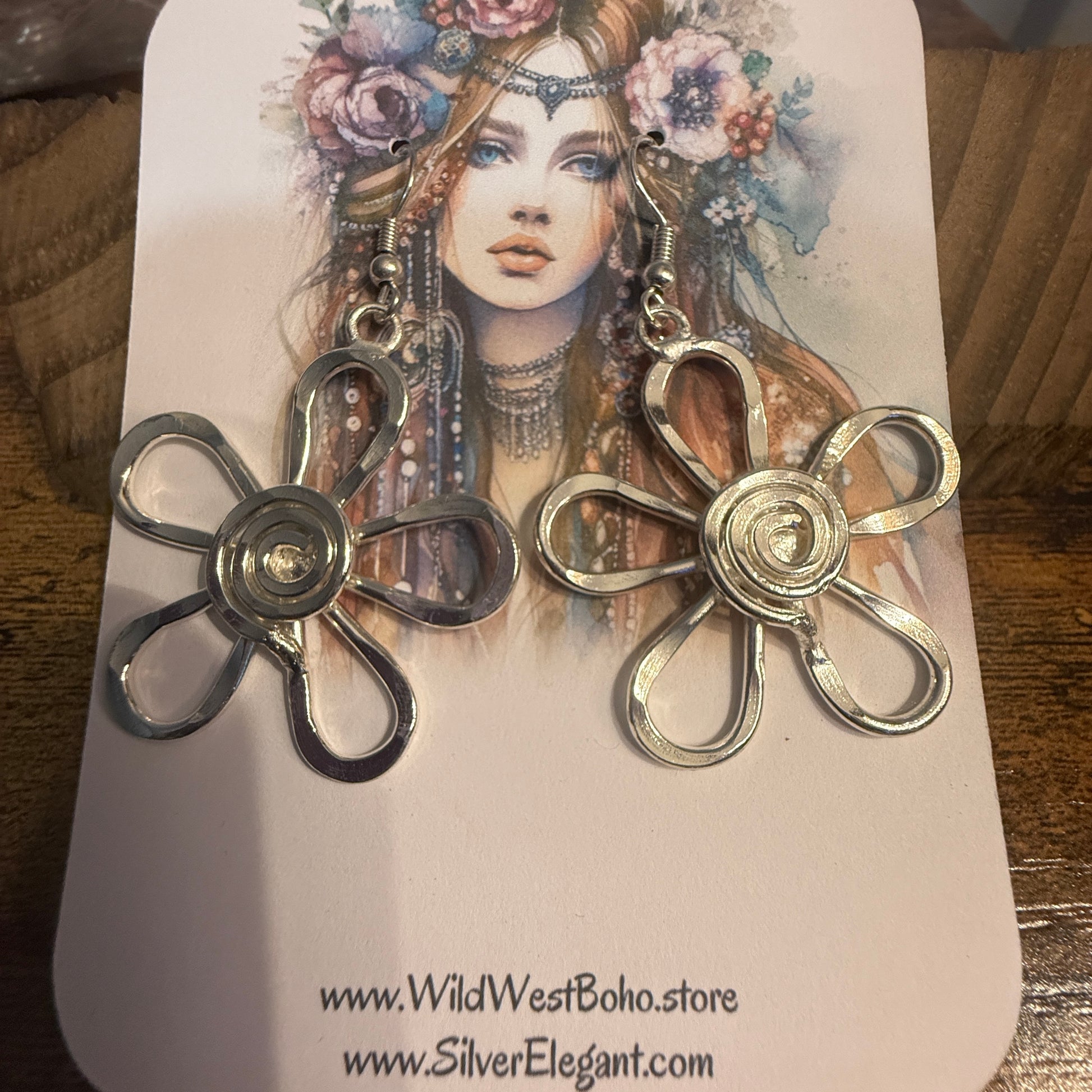Silver Plated Earrings Spiral Center Flower Handcrafted Disco Vibes Jewelry