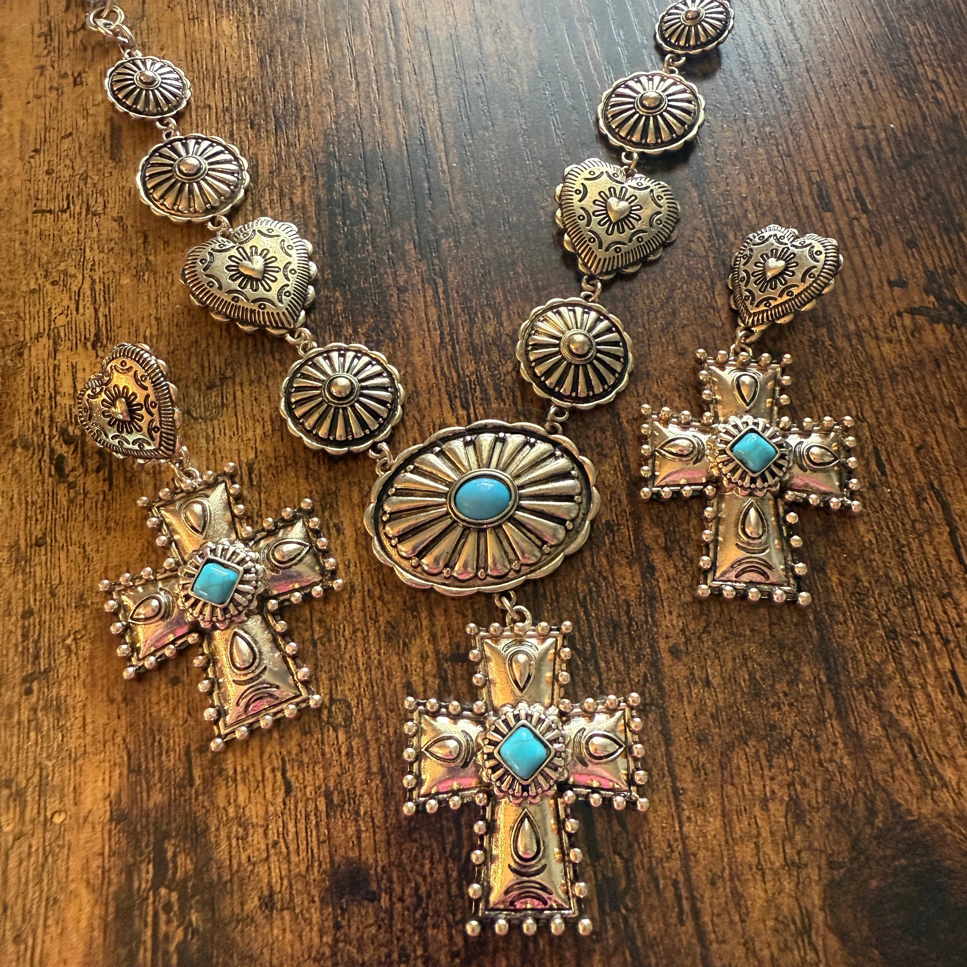 Why to buy this product? Embrace a piece that blends traditional artistry with modern versatility. This set offers genuine turquoise, skilled handiwork in mixed metals, and a Native American-inspired cross motif that pairs beautifully with any outfit, making it a standout addition to any jewelry collection.