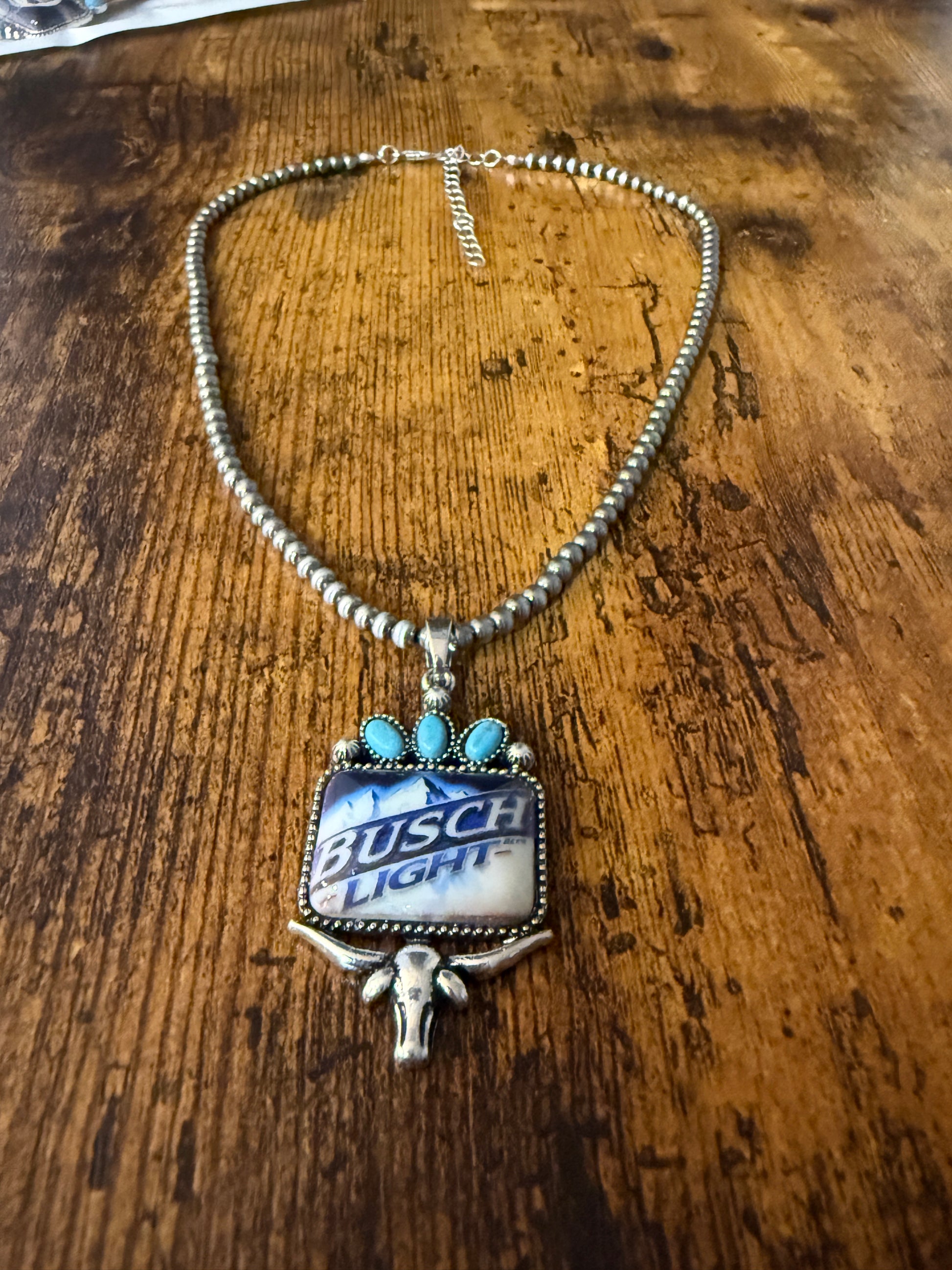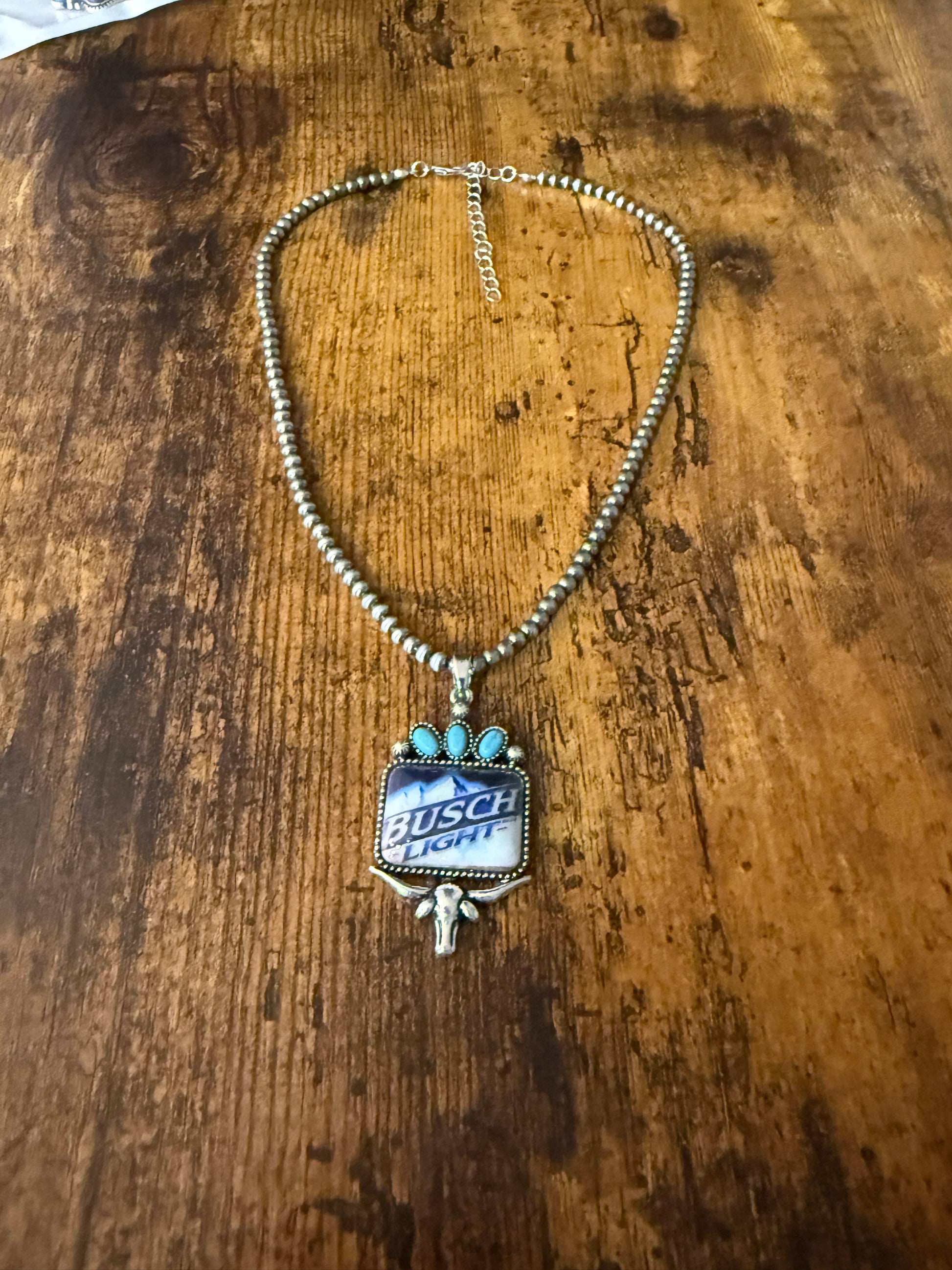 South Western Cowgirls Busch Light Silver Pearl Choker Pendant Necklace