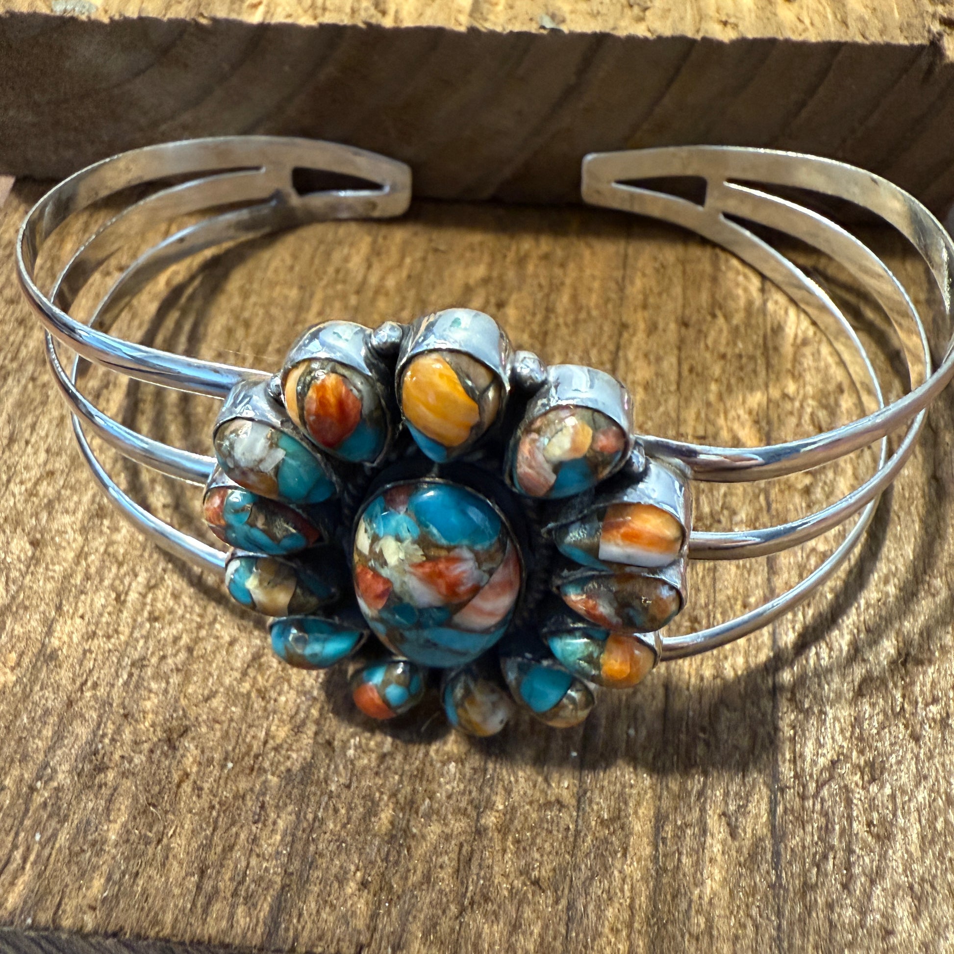 Elevate your accessory game with this handcrafted Spiny Oyster Turquoise Gemstone Cuff in 925 Sterling Silver. Featuring a Spiny Oyster Turquoise Dahlia displaying vivid orange and turquoise hues, the cuff blends natural beauty with artisanal craftsmanship. Its adjustable design ensures a comfortable fit for different wrist sizes.