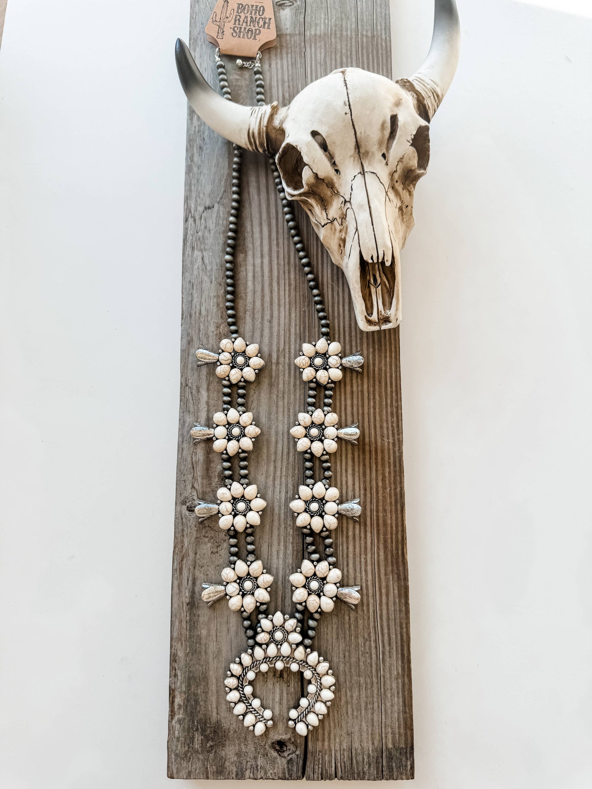 This Squash Blossom Necklace is not just a piece of jewelry; it's a statement of style and culture. Add this unique accessory to your collection and let your individuality shine through. Elevate your wardrobe and express your love for Western flair with this beautifully crafted necklace from Boho Ranch Shop!