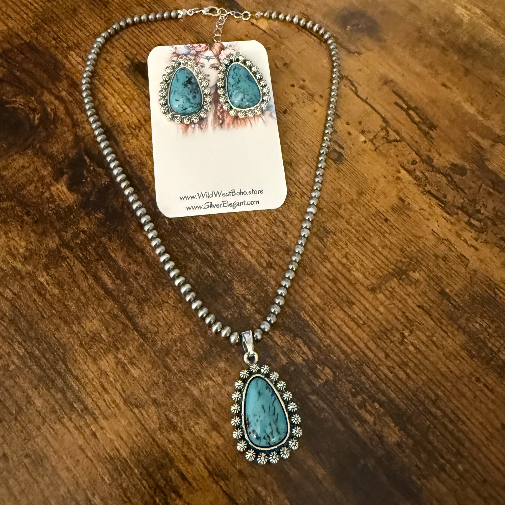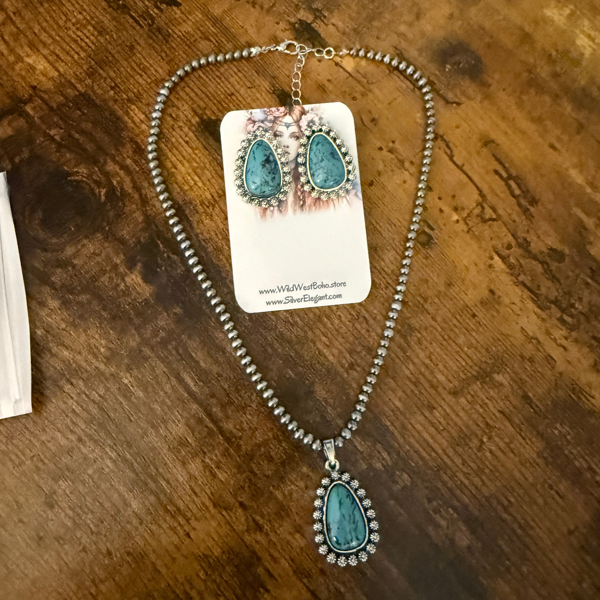 Elevate your jewelry collection with a sophisticated two-piece turquoise and silver pearls set that transitions seamlessly from day to night.