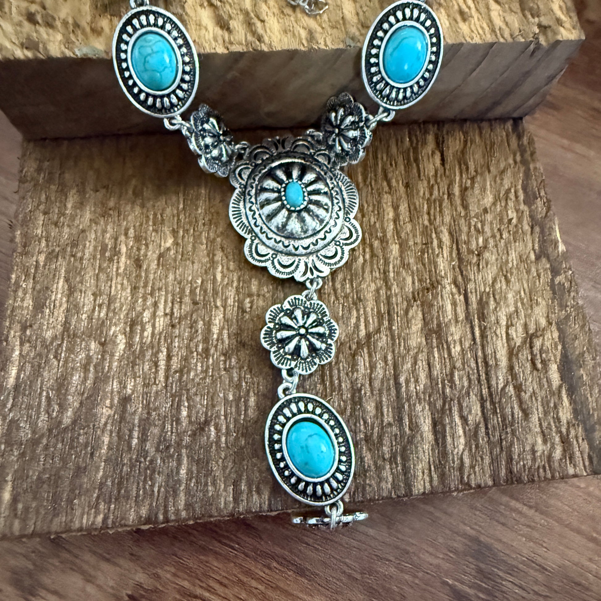 Elevate your accessory game with the stunning Turquoise Stone Western Flower Concho Y Drop Necklace from Boho Ranch Shop. This beautifully crafted piece seamlessly blends traditional western charm with modern elegance, making it perfect for any occasion.