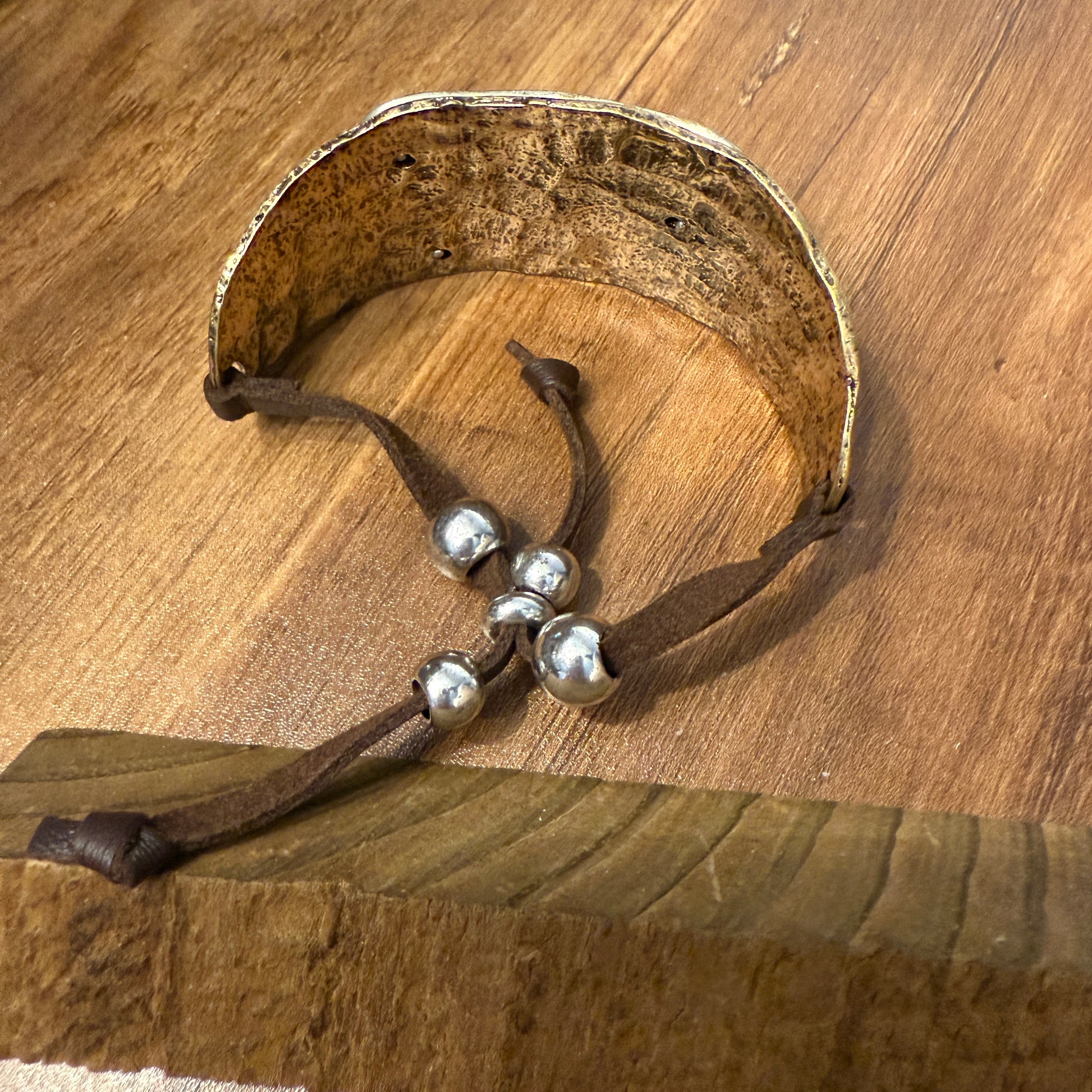 - Patina-colored bracelet cuff featuring a copper cross and a gold praying gesture on a silver plate.