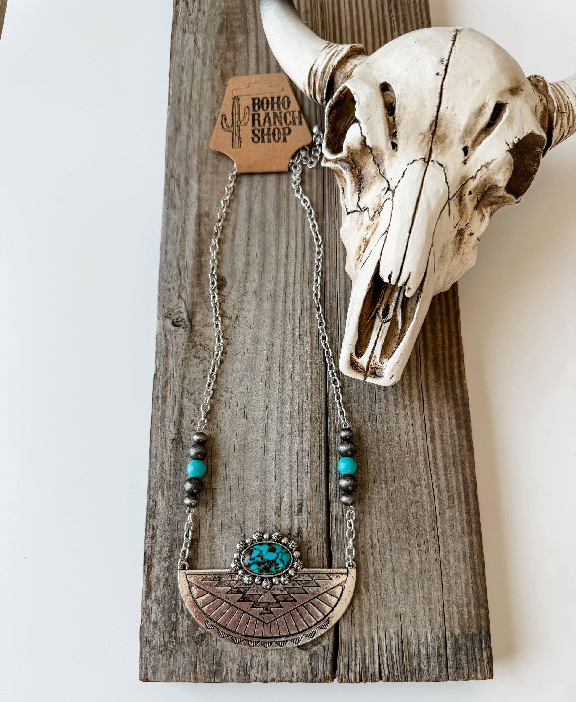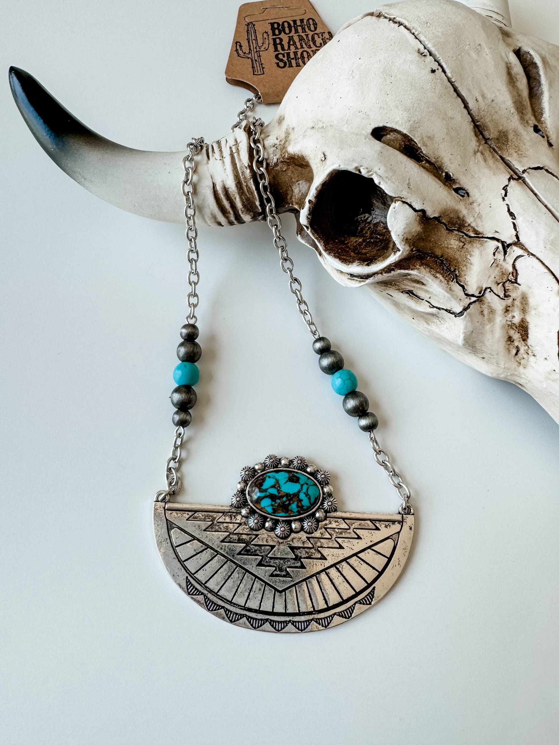 - Striking Design: Featuring a beautiful burnished silver finish complemented by vibrant turquoise stones, this necklace is a true statement piece that captures the essence of the Western aesthetic.