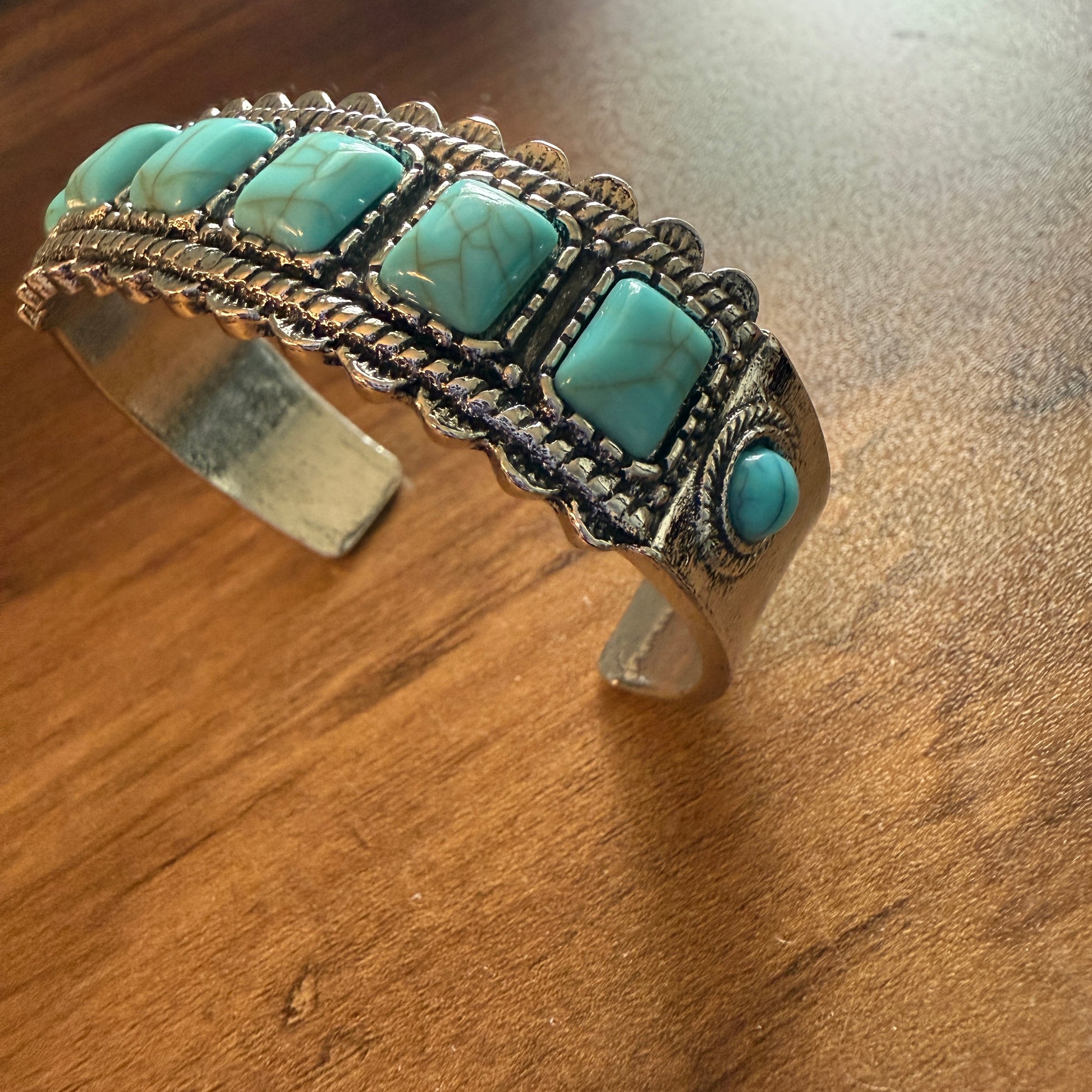 Why to buy this product? If you want a standout piece that instantly elevates casual outfits or anchors a layered bracelet look, this Western Cowgirl Turquoise Gemstone Cuff Bangle with Mixed Metals delivers. The faux turquoise captures the iconic Southwestern vibe at an accessible price, while the mixed metals coordinate with gold and silver jewelry you already own—making it a versatile, value-rich addition to any jewelry collection.