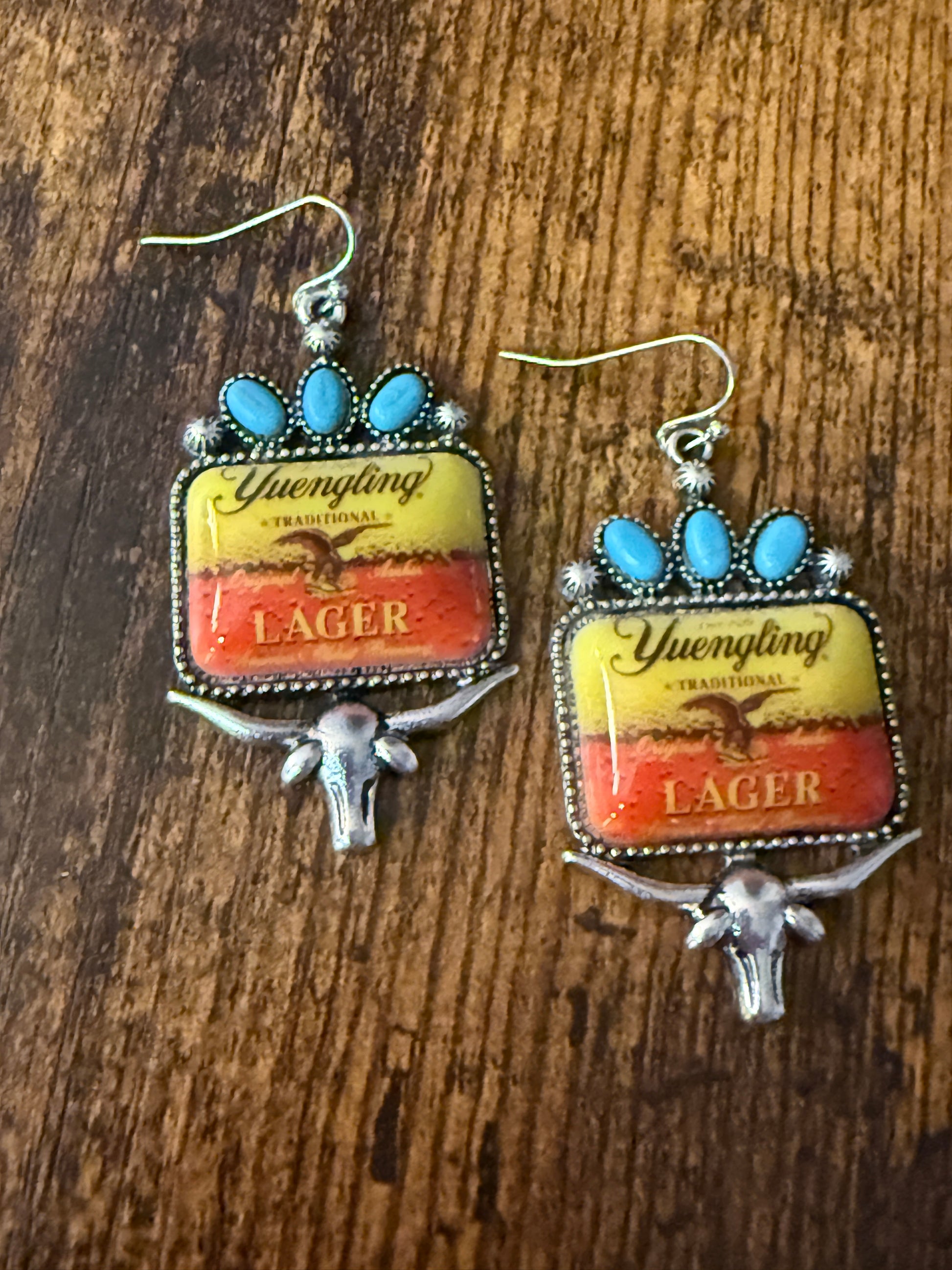 Concise, enticing description of handcrafted Western Cowgirl Yuengling Lager Drop Wire Earrings in mixed metals, blending craft beer culture with Western flair.