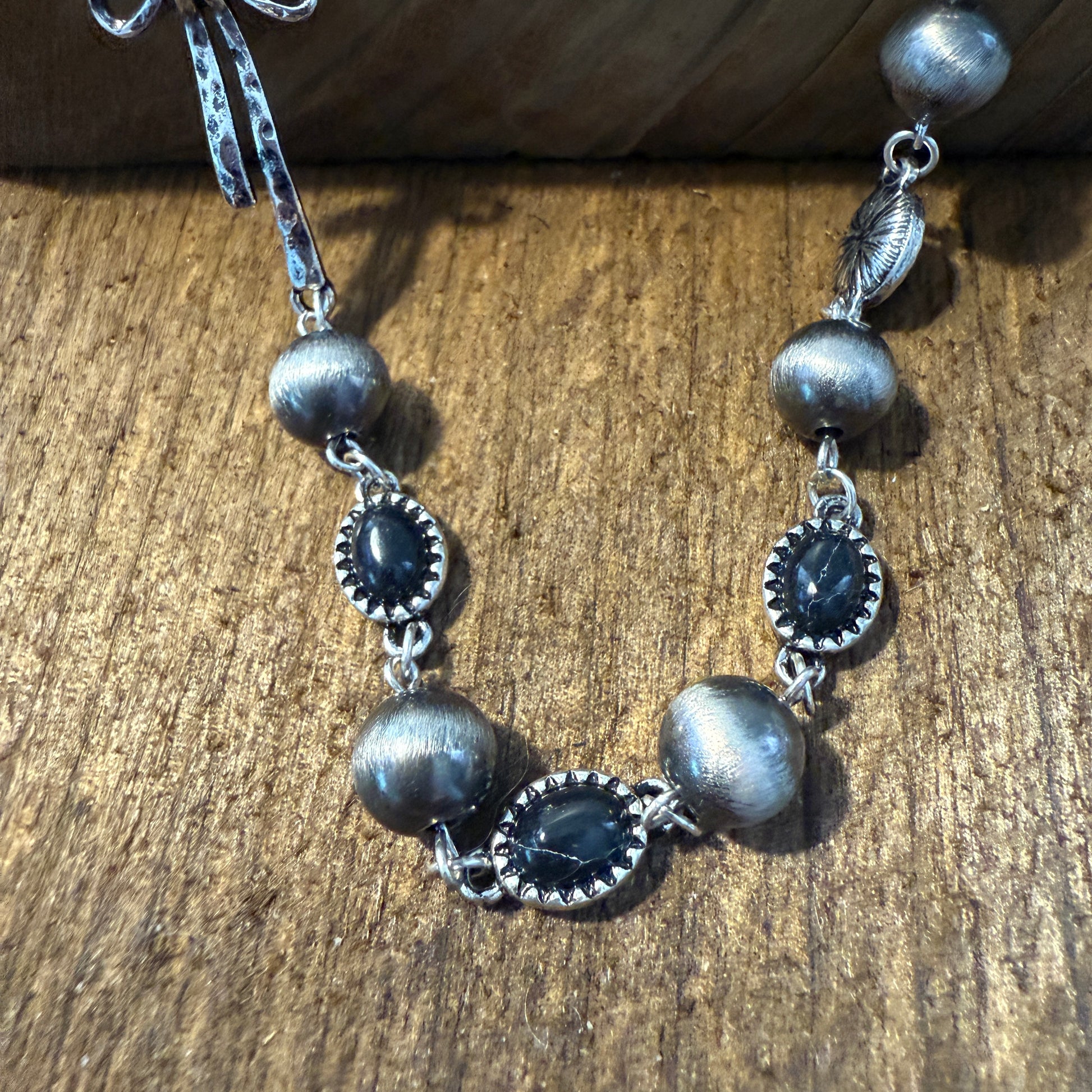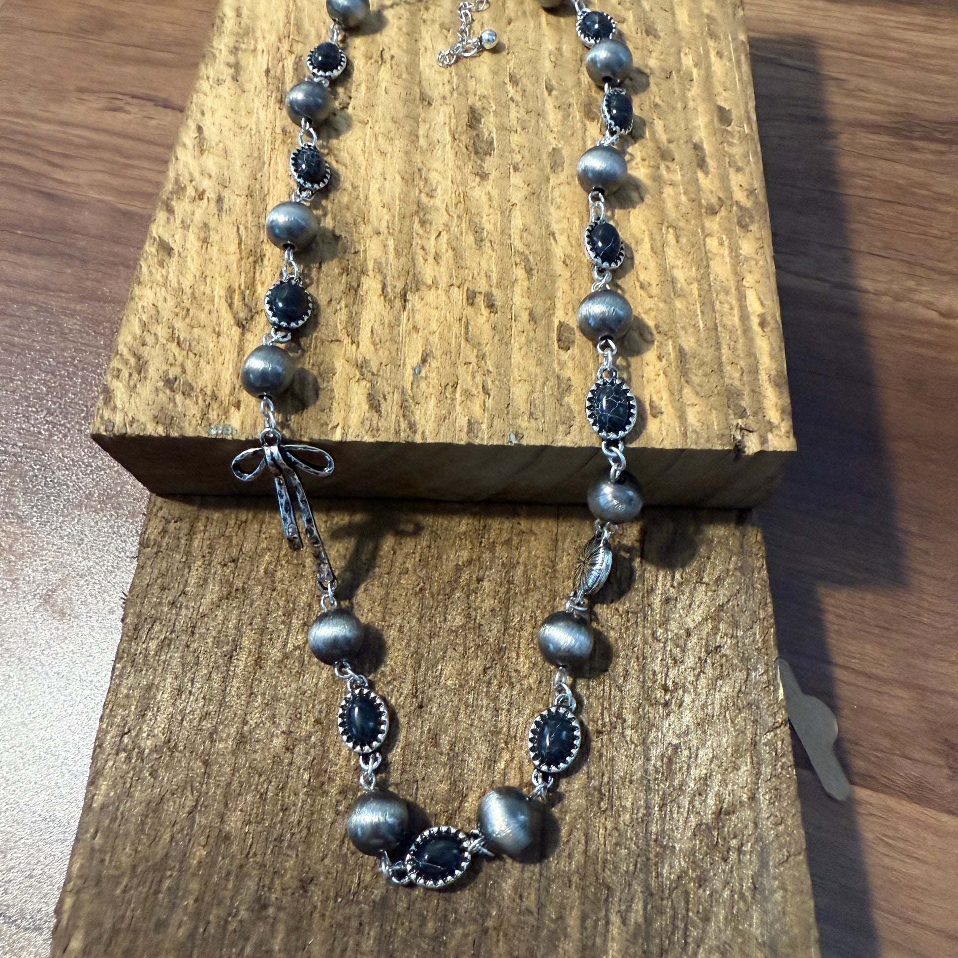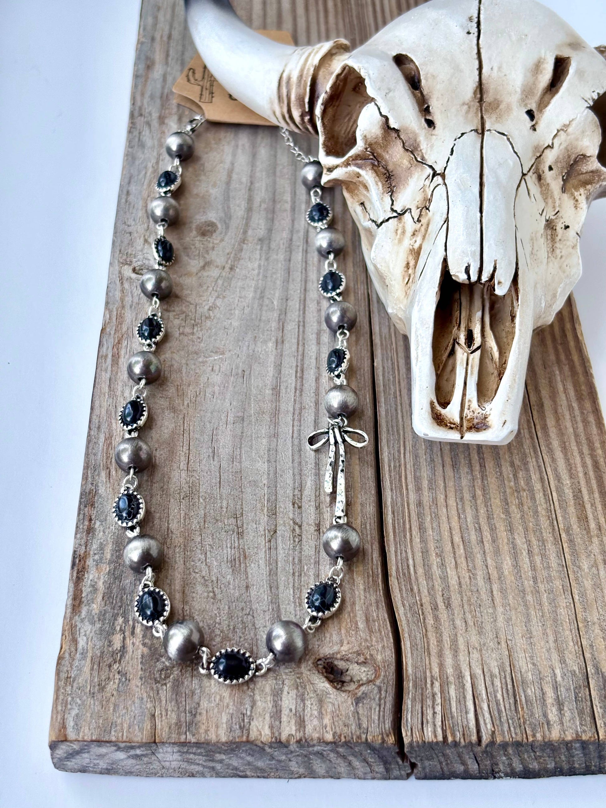 Western Style Navajo Pearl Stone Coquette Bow Necklace in Black and Brushed Silver