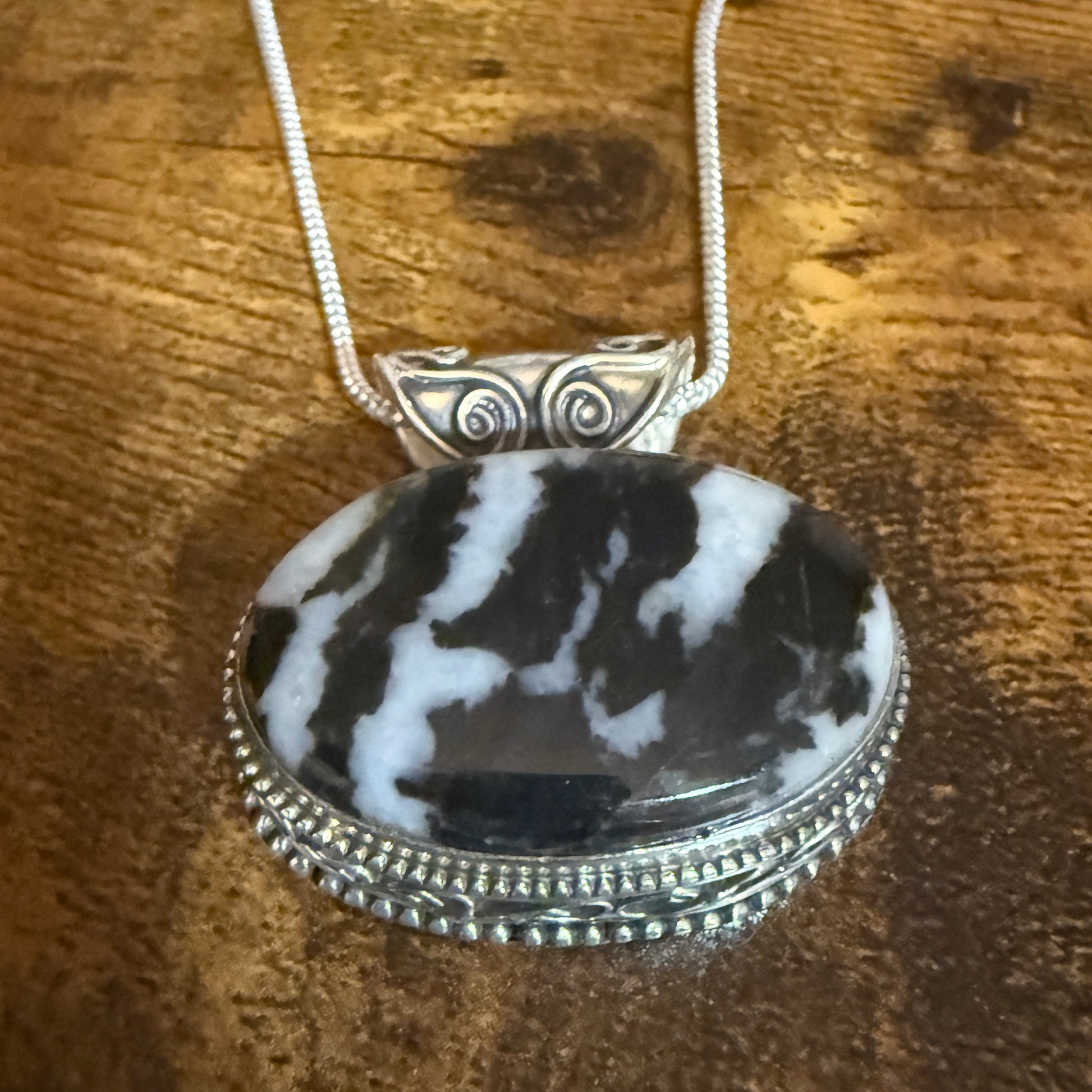 Exclusive, handcrafted necklace featuring White Buffalo Turquoise in a vintage ethnic bezel, set in 925 sterling silver with an 18-inch chain.