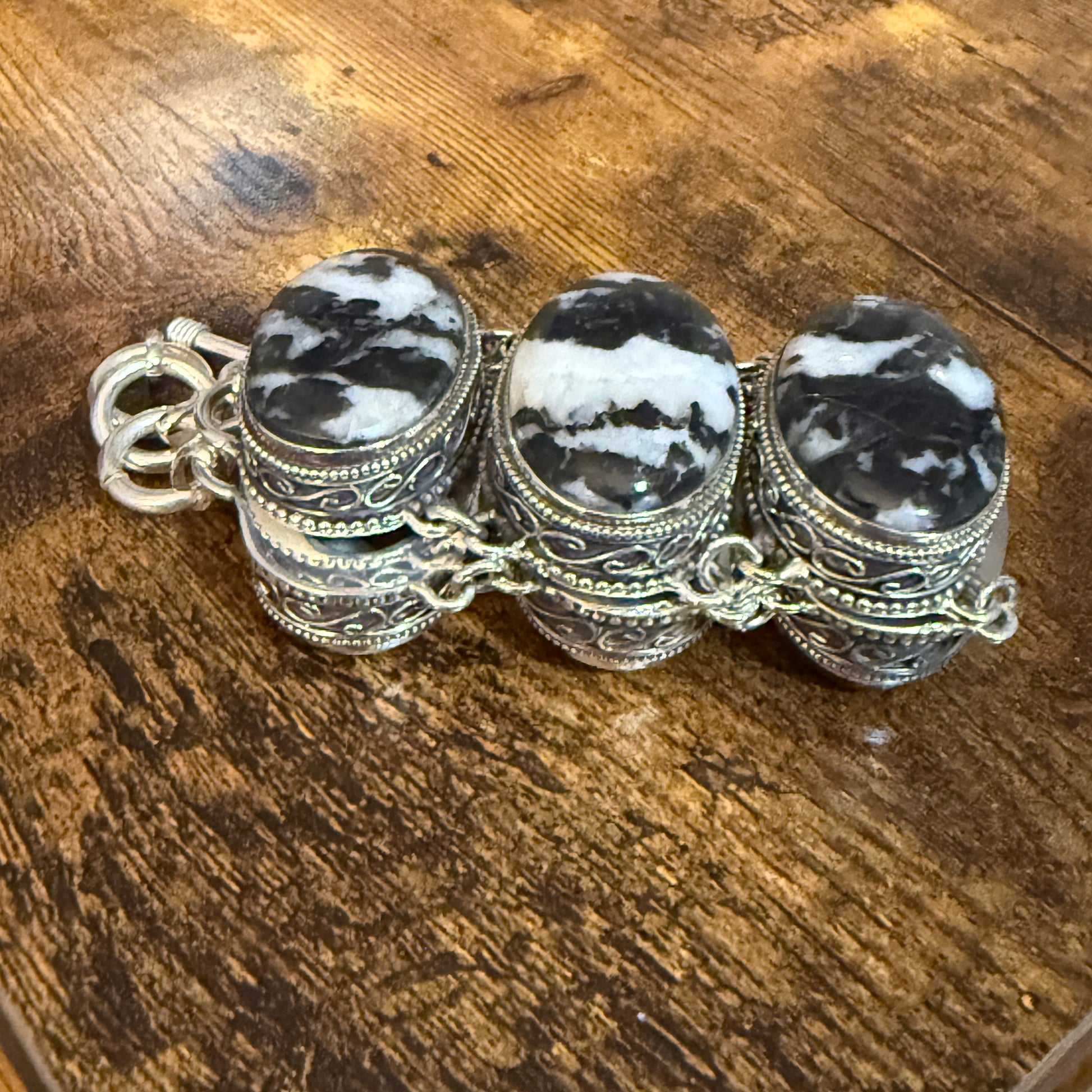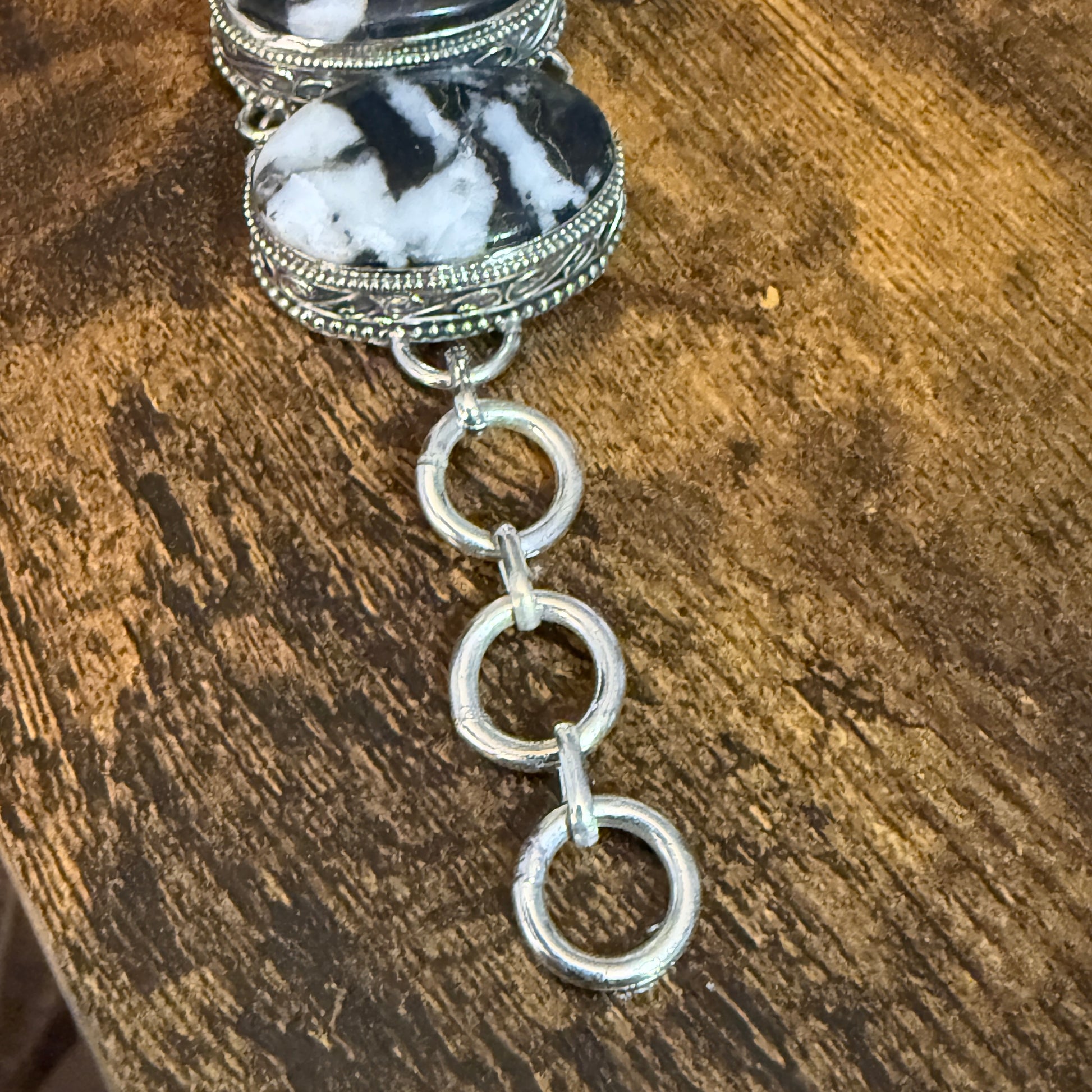 - White Buffalo Turquoise Dalhia gemstone links set in a polished Sterling Silver bracelet