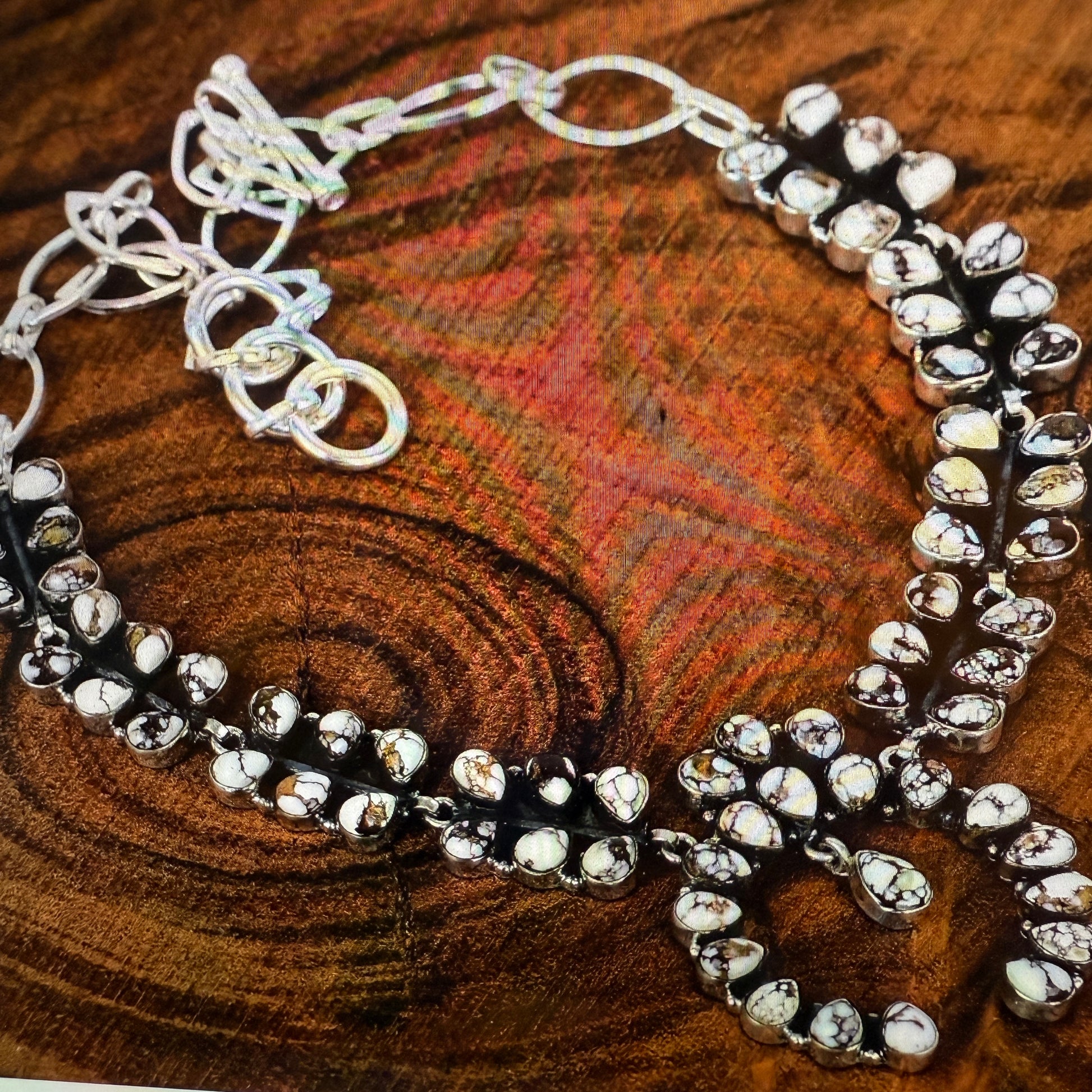 Experience the bold, artisanal elegance of the Wild Horse Turquoise Dalhia Gemstone Squash Navajo Necklace in Sterling Silver—where Native American craftsmanship meets vibrant natural stones. Handcrafted Navajo artistry in sterling silver featuring true Wild Horse turquoise and a Dalhia gemstone for striking color and one-of-a-kind patterns. The squash-style pendant with a high-polish finish frames the neckline beautifully, while a secure chain keeps this standout piece close to the heart.