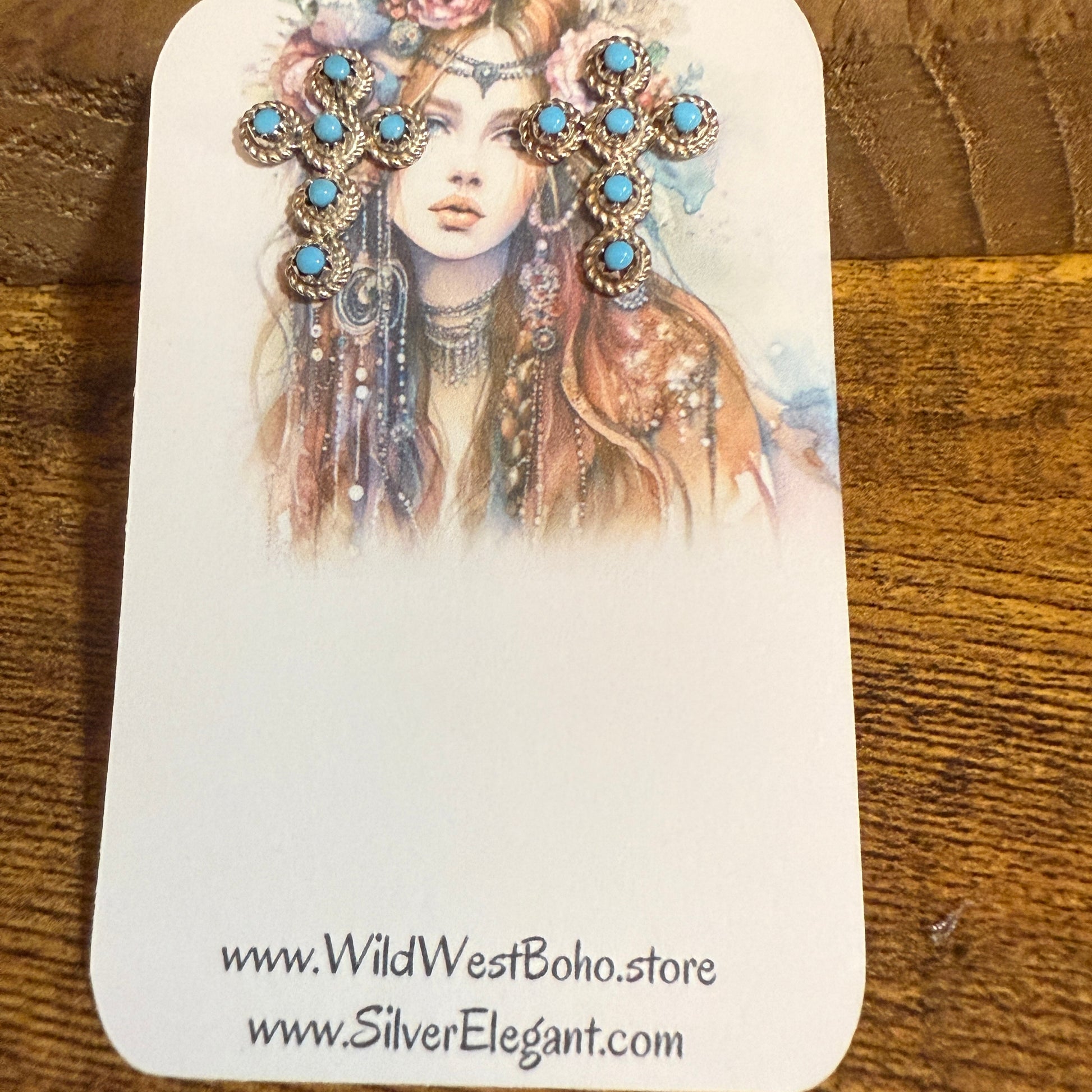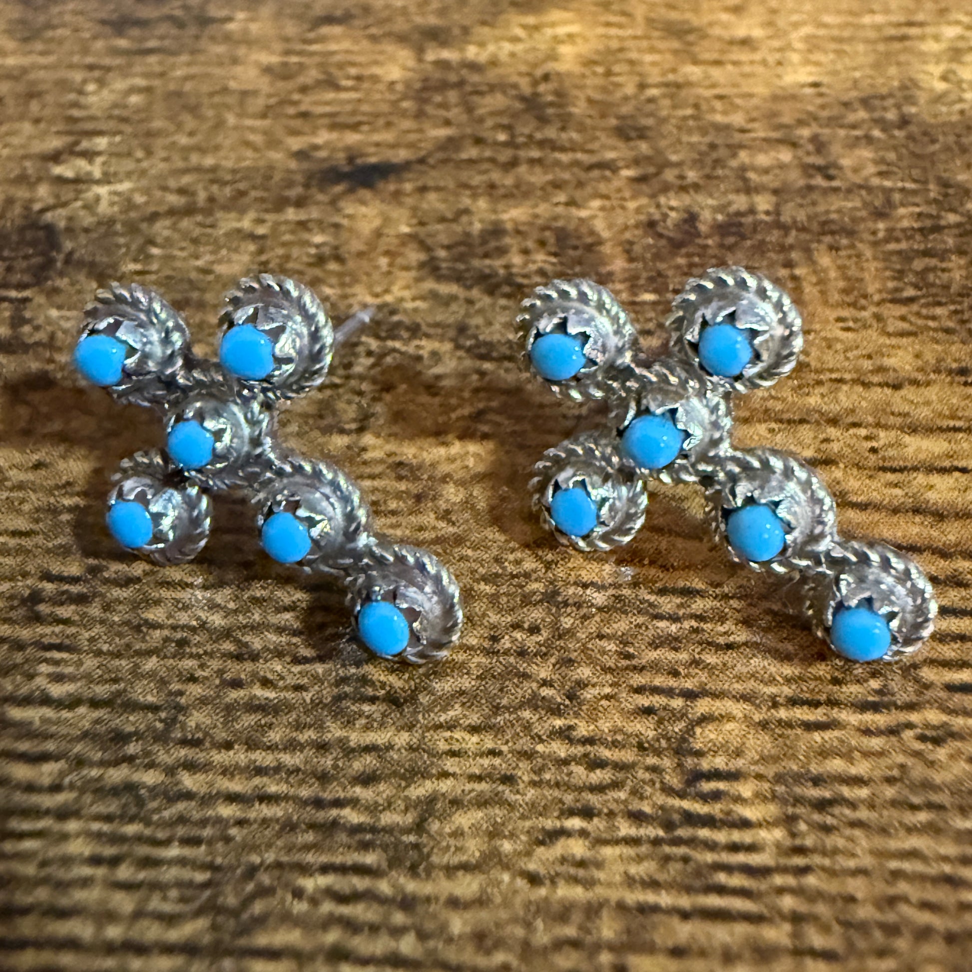 Timeless Native American craftsmanship in a delicate cross design—Zuni Turquoise Cross Stud Earrings in Sterling Silver, signed by Nakatewa.