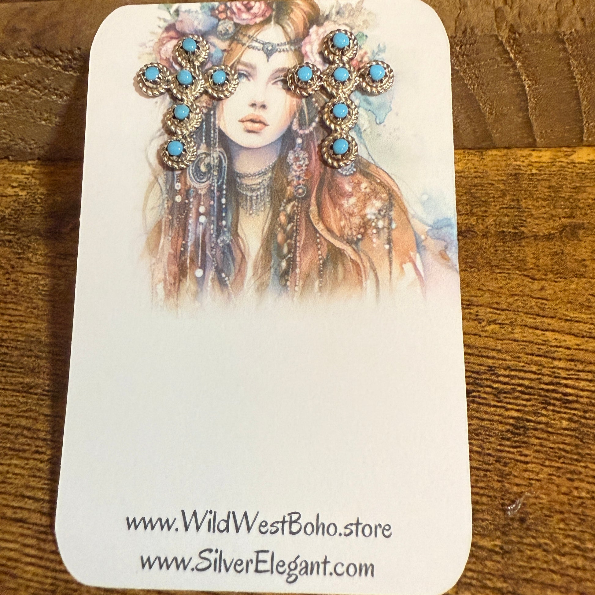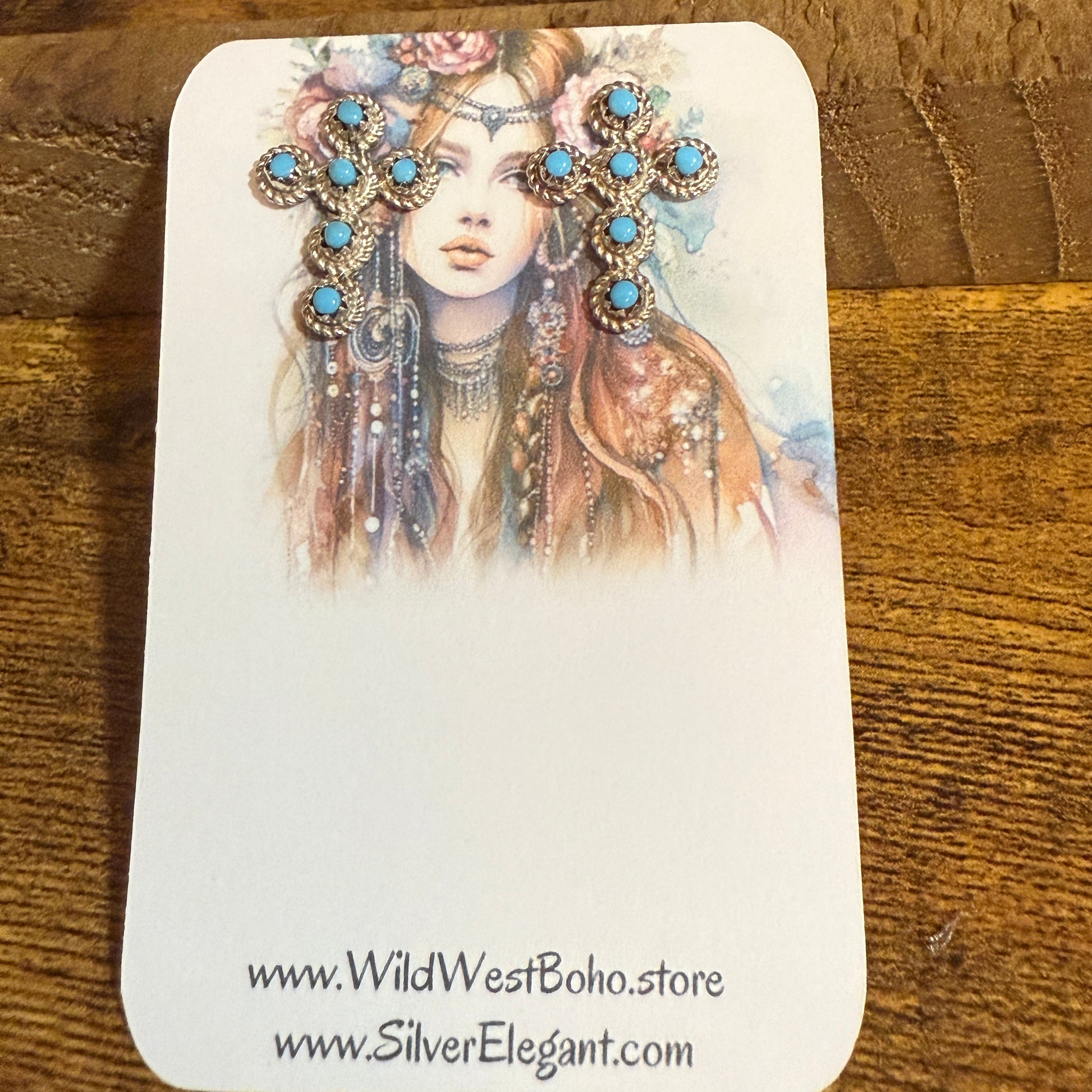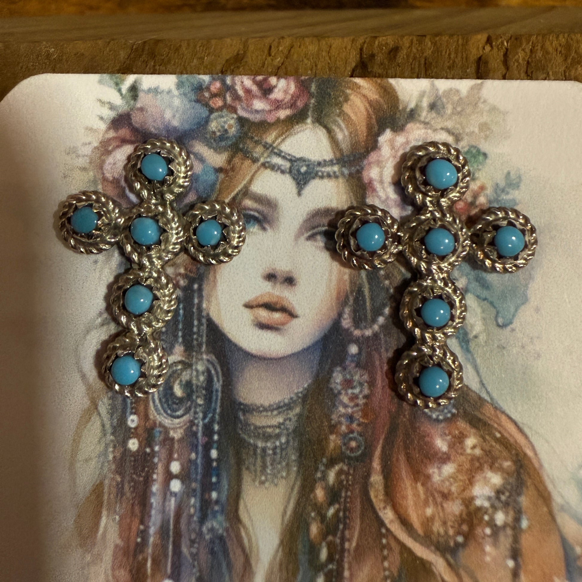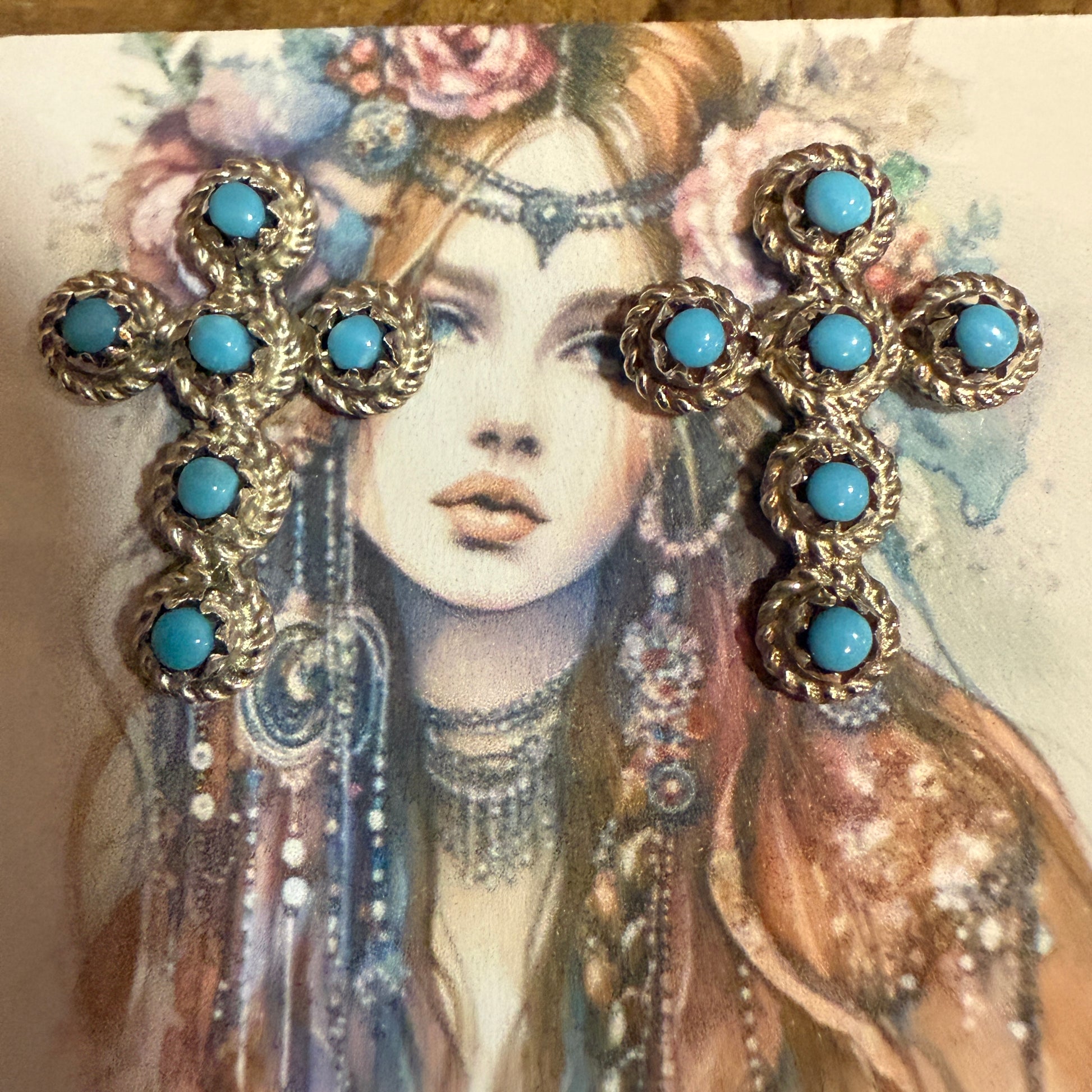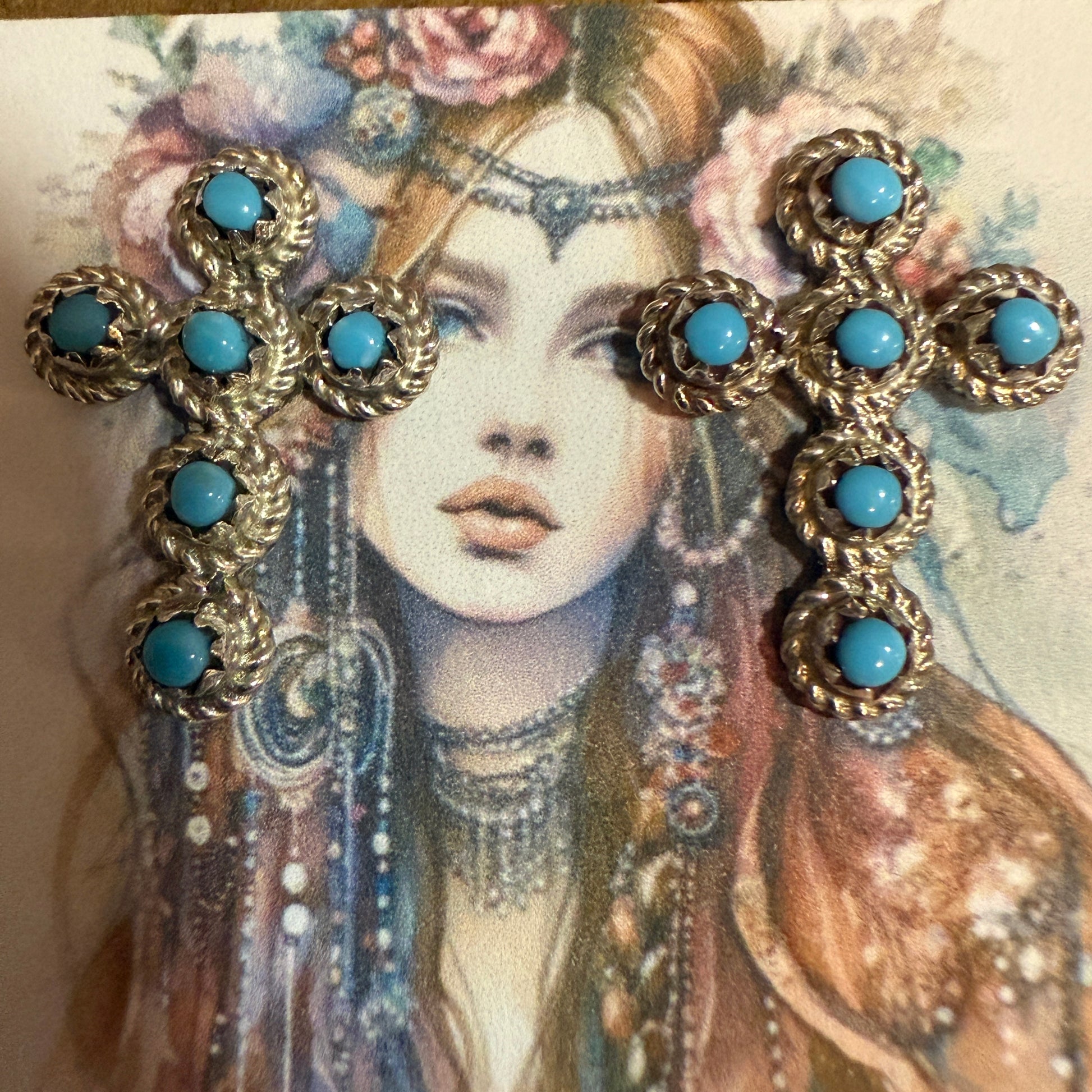 - Six genuine turquoise stones bezel-set in sterling silver create a striking cross motif; each stone is hand-polished for a luminous, natural look. Size: 3/4" x 1/2"; weight ~3 grams per pair.